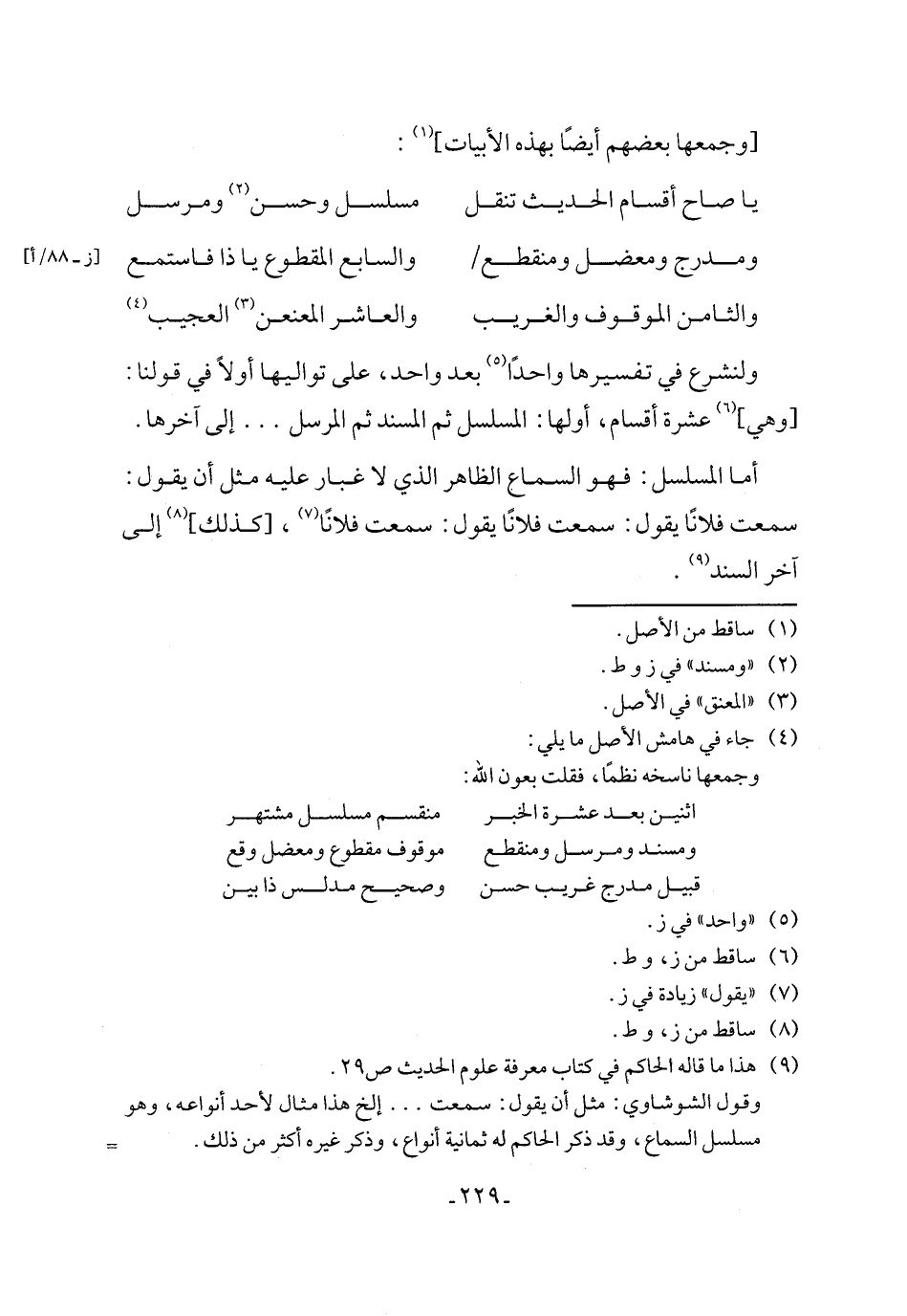 ولنشرع في تفسيرها واحدًا (٥) بعد واحد، على تواليها أولًا في قولنا: [وهي] (٦) عشرة أقسام، أولها: المسلسل ثم المسند ثم المرسل ... إلى آخرها.