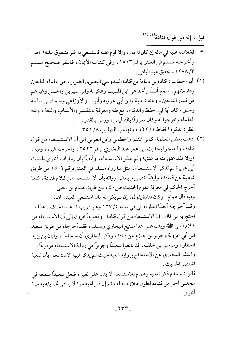 قالوا: وعدم ذكر شعبة وهمام للاستسعاء لا يدل على نفيه، فلعل سعيدًا سمعه في مجلس آخر من قتادة لطول ملازمته له، ثم إن فتياه به مرة لا ينافي تحديثه به مرة أخرى. =