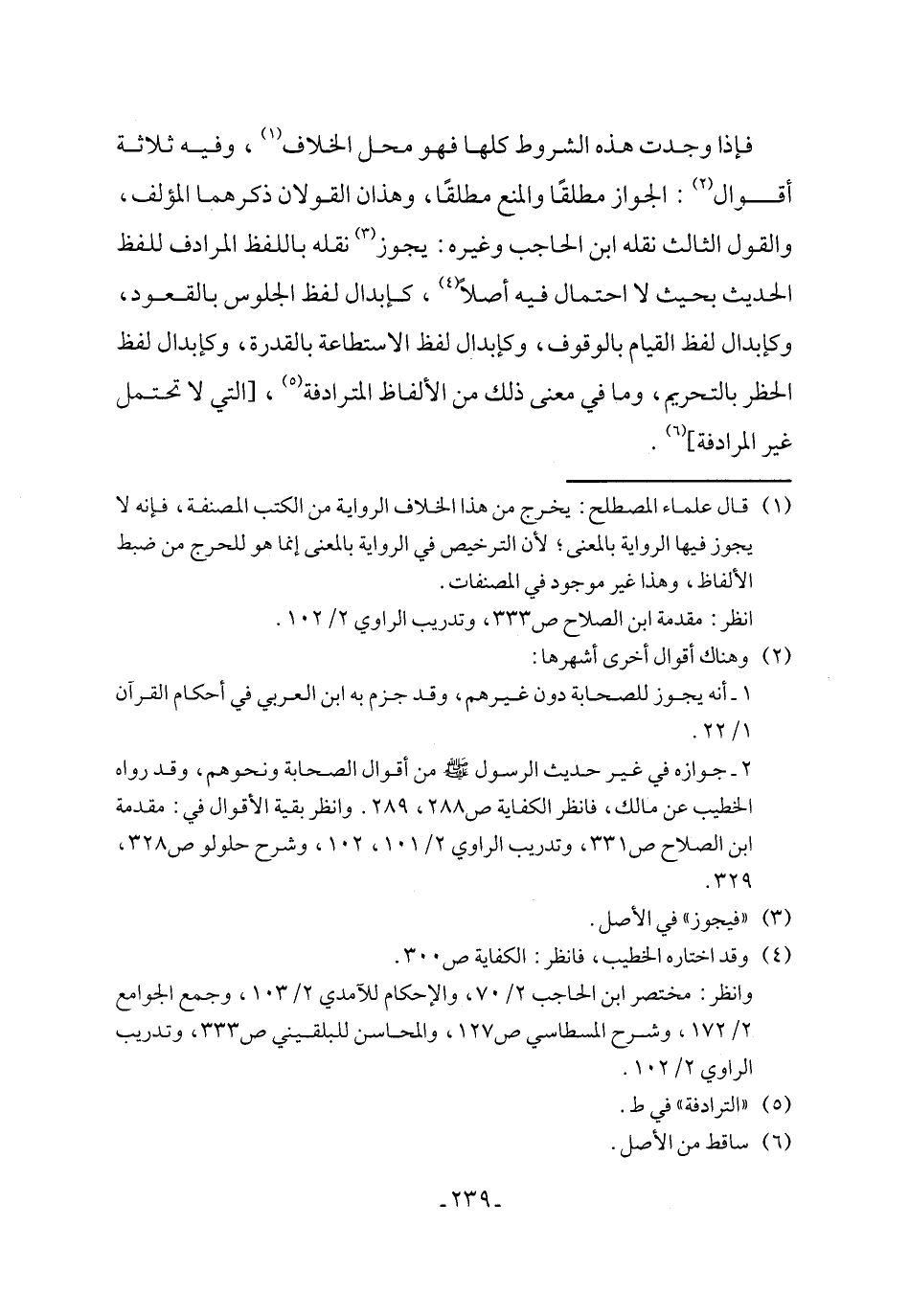 فإذا وجدت هذه الشروط كلها فهو محل الخلاف (١)، وفيه ثلاثة أقوال (٢): الجواز مطلقًا والمنع مطلقًا، وهذان القولان ذكرهما المؤلف، والقول الثالث نقله ابن الحاجب وغيره: يجوز (٣) نقله باللفظ المرادف للفظ الحديث بحيث لا احتمال فيه أصلًا (٤)، كإبدال لفظ الجلوس بالقعود، وكإبدال لفظ القيام بالوقوف، وكإبدال لفظ الاستطاعة بالقدرة، وكإبدال لفظ الحظر بالتحريم، وما في معنى ذلك من الألفاظ المترادفة (٥)، [التي لا تحتمل غير المرادفة] (٦).