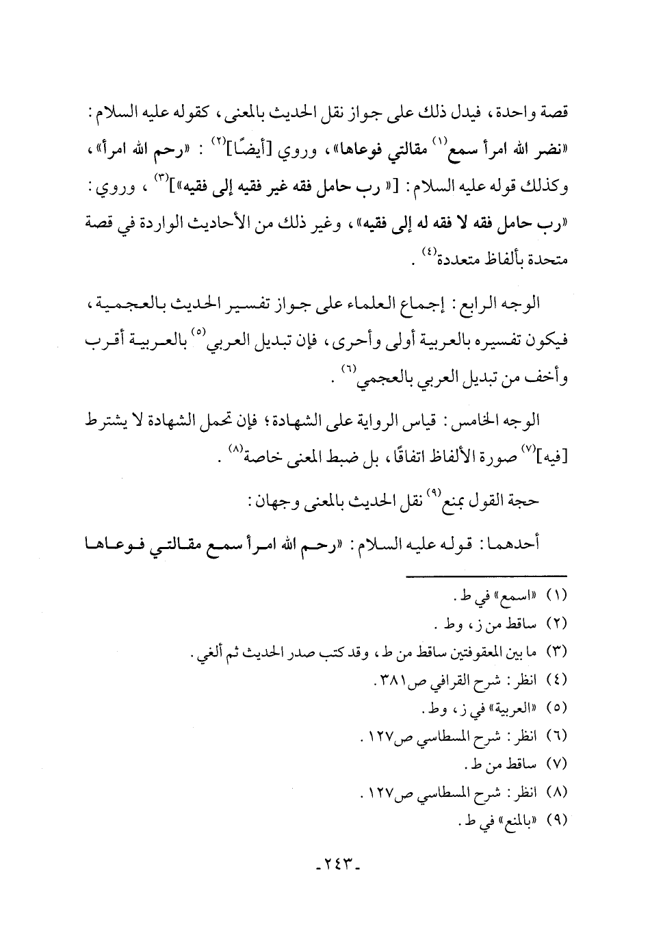 حجة القول بمنع (٩) نقل الحديث بالمعنى وجهان: