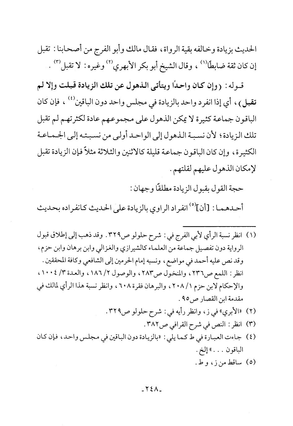 قوله: (وإِن كان واحدًا ويتأتى الذهول عن تلك الزيادة قبلت وإِلا لم تقبل)، أي إذا انفرد واحد بالزيادة في مجلس واحد دون الباقين (٤)، فإن كان الباقون جماعة كثيرة لا يمكن الذهول على مجموعهم عادة لكثرتهم لم تقبل تلك الزيادة؛ لأن نسبة الذهول إلى الواحد أولى من نسبته إلى الجماعة الكثيرة، وإن كان الباقون جماعة قليلة كالاثنين والثلاثة مثلًا فإن الزيادة تقبل لإمكان الذهول عليهم لقلتهم.