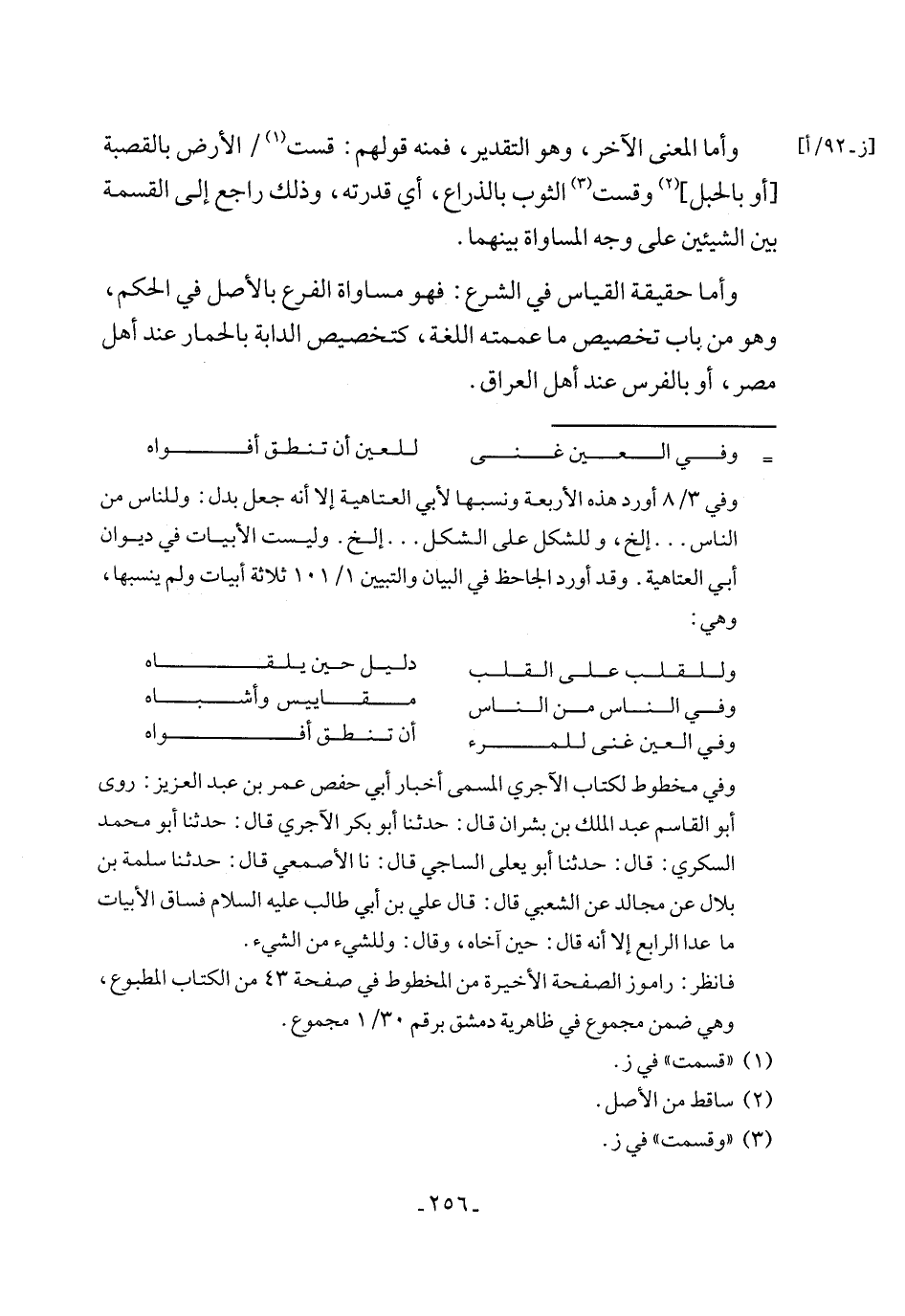 وأما المعنى الآخر، وهو التقدير، فمنه قولهم: قست (١) الأرض بالقصبة [أو بالحبل] (٢) وقست (٣) الثوب بالذراع، أي قدرته، وذلك راجع إلى القسمة بين الشيئين على وجه المساواة بينهما.
