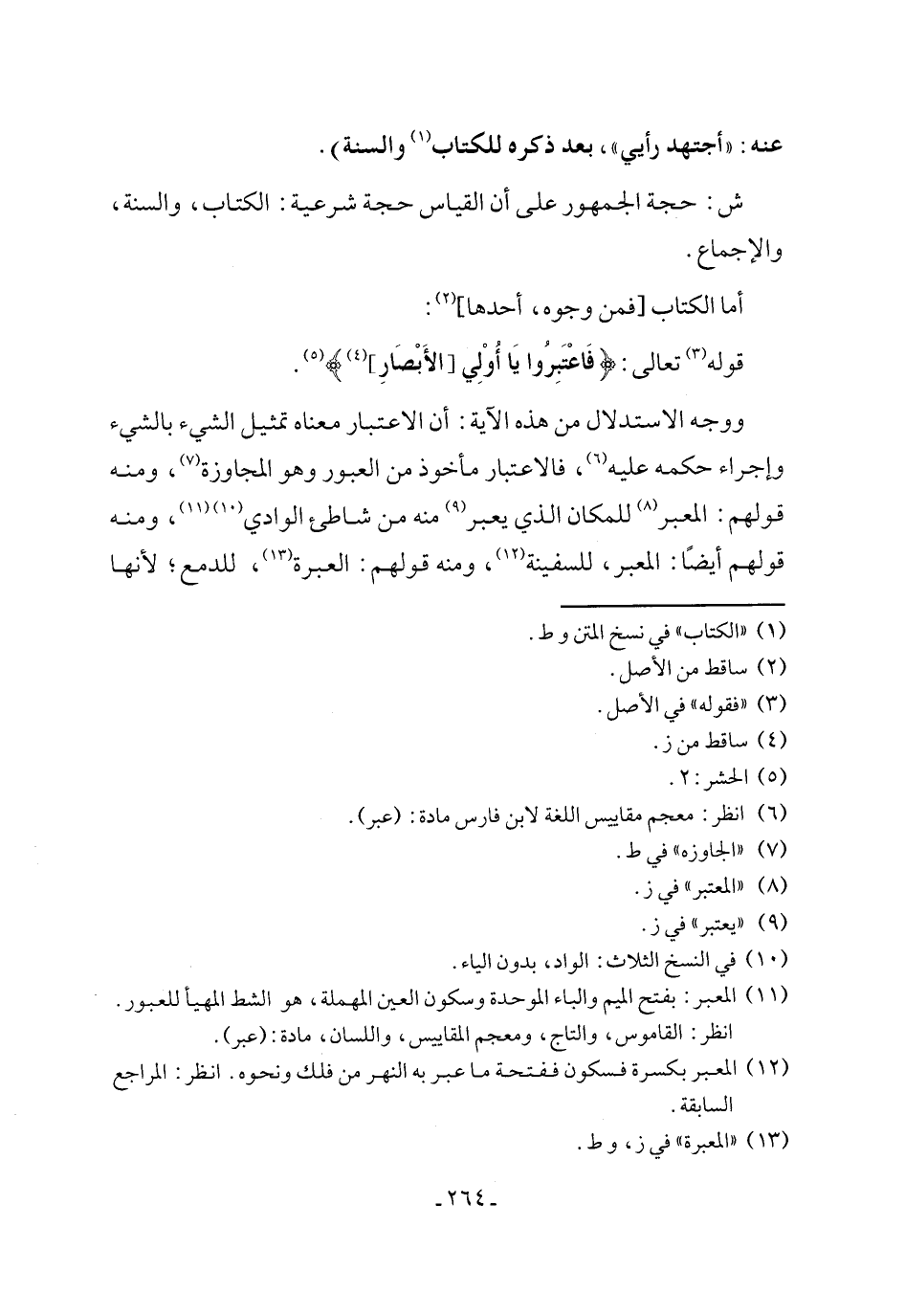 ووجه الاستدلال من هذه الآية: أن الاعتبار معناه تمثيل الشيء بالشيء وإجراء حكمه عليه (٦)، فالاعتبار مأخوذ من العبور وهو المجاوزة (٧)، ومنه قولهم: المعبر (٨) للمكان الذي يعبر (٩) منه من شاطئ الوادي (١٠) (١١)، ومنه قولهم أيضًا: المعبر، للسفينة (١٢)، ومنه قولهم: العبرة (١٣)، للدمع؛ لأنها
