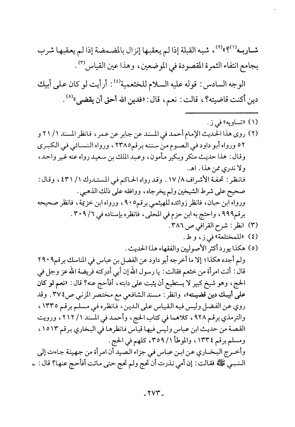 الوجه السادس: قوله عليه السلام للخثعمية (٤): أرأيت لو كان على أبيك دين أكنت قاضيته؟، قالت: نعم، قال: "فدين الله أحق أن يقضى" (٥).
