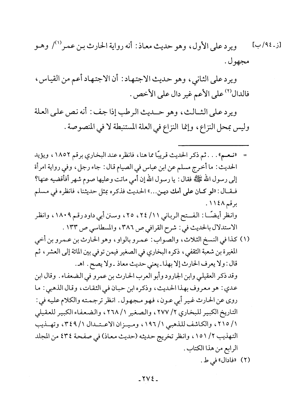 ويرد على الثالث، وهو حديث الرطب إذا جف: أنه نص على العلة وليس بمحل النزاع، وإنما النزاع في العلة المستنبطة لا في المنصوصة.