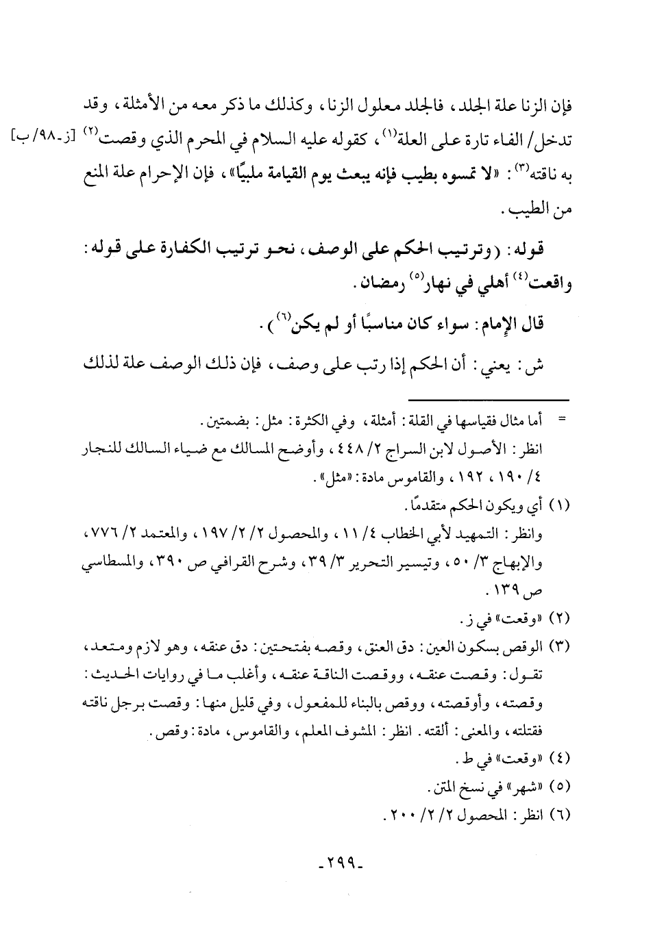 قوله: (وترتيب الحكم على الوصف، نحو ترتيب الكفارة على قوله: واقعت (٤) أهلي في نهار (٥) رمضان.
