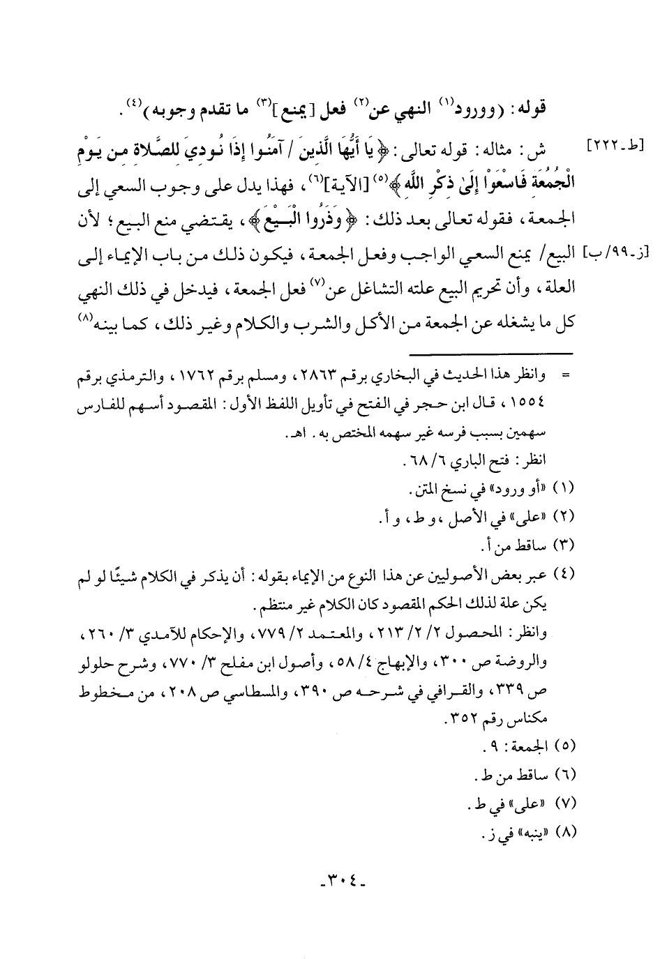 ش: مثاله: قوله تعالى: {يَاأَيُّهَا الَّذِينَ آمَنُوا إِذَا نُودِيَ لِلصَّلَاةِ مِنْ يَوْمِ الْجُمُعَةِ فَاسْعَوْا إِلَى ذِكْرِ اللَّهِ} (٥) [الآية] (٦)، فهذا يدل على وجوب السعي إلى الجمعة، فقوله تعالى بعد ذلك: {وَذَروا الْبَيْعَ}، يقتضي منع البيع؛ لأن البيع يمنع السعي الواجب وفعل الجمعة، فيكون ذلك من باب الإيماء إلى العلة، وأن تحريم البيع علته التشاغل عن (٧) فعل الجمعة، فيدخل في ذلك النهي كل ما يشغله عن الجمعة من الأكل والشرب والكلام وغير ذلك، كما بينه (٨)