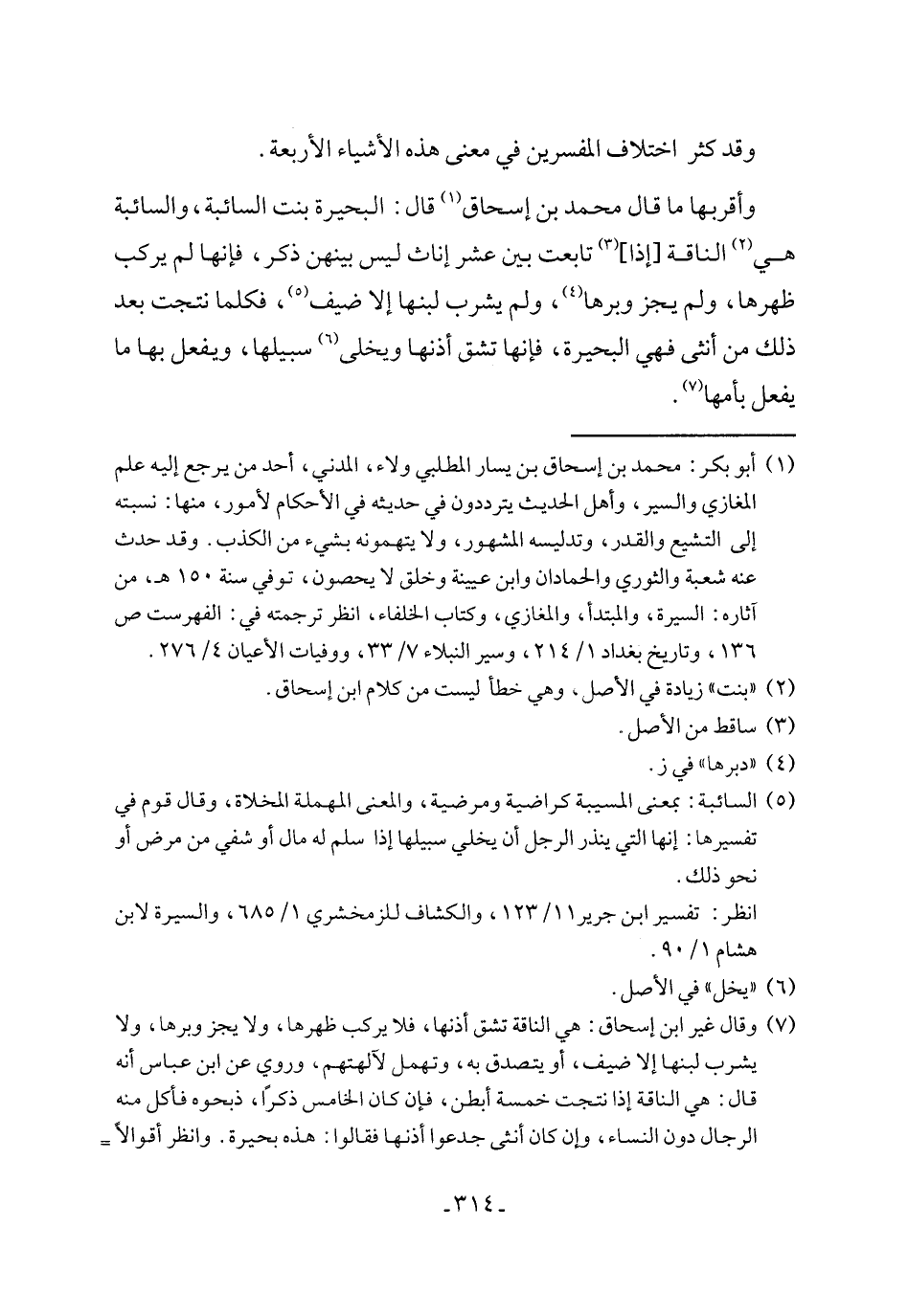 (٧) وقال غير ابن إسحاق: هي الناقة تشق أذنها، فلا يركب ظهرها، ولا يجز وبرها، ولا يشرب لبنها إلا ضيف، أو يتصدق به، وتهمل لآلهتهم، وروي عن ابن عباس أنه قال: هي الناقة إذا نتجت خمسة أبطن، فإن كان الخامس ذكرًا، ذبحوه فأكل منه الرجال دون النساء، وإن كان أنثى جدعوا أذنها فقالوا: هذه بحيرة. وانظر أقوالاً =