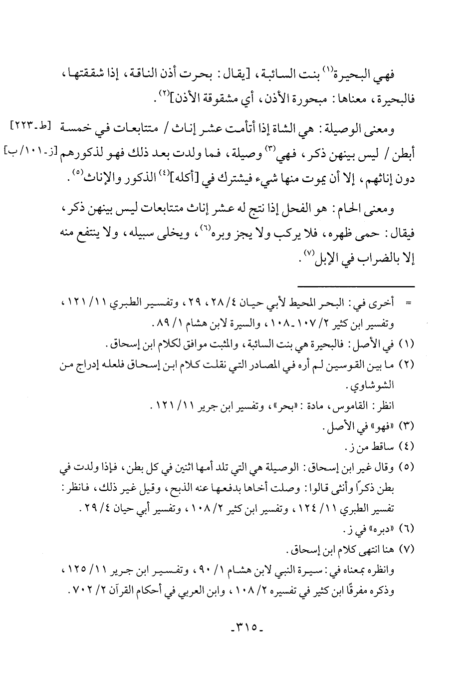 (٥) وقال غير ابن إسحاق: الوصيلة هي التي تلد أمها اثنين في كل بطن، فإذا ولدت في بطن ذكرًا وأنثى قالوا: وصلت أخاها بدفعها عنه الذبح، وقيل غير ذلك، فانظر: تفسير الطبري ١١/ ١٢٤، وتفسير ابن كثير ٢/ ١٠٨، وتفسير أبي حيان ٤/ ٢٩.