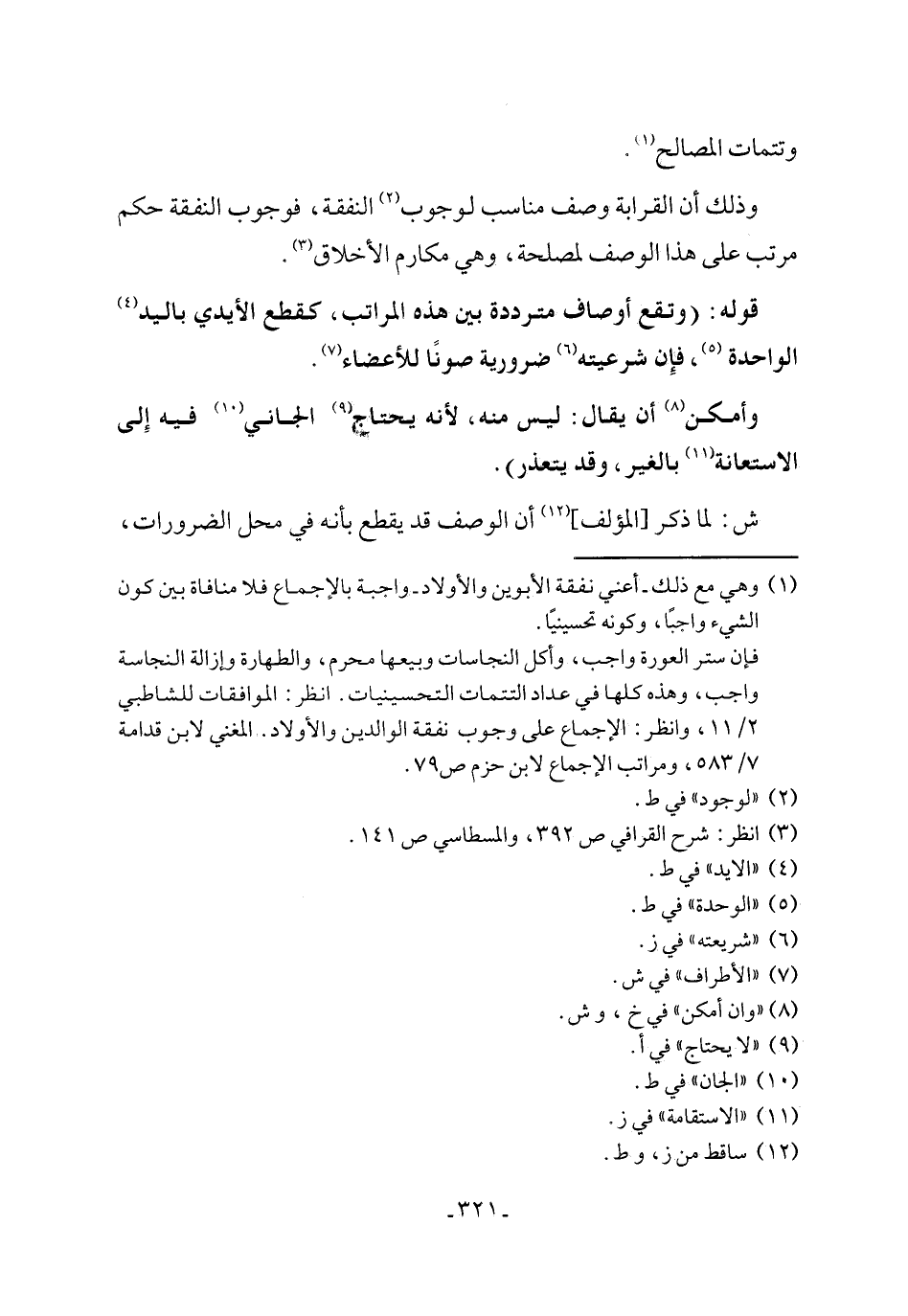 وذلك أن القرابة وصف مناسب لوجوب (٢) النفقة، فوجوب النفقة حكم مرتب على هذا الوصف لمصلحة، وهي مكارم الأخلاق (٣).