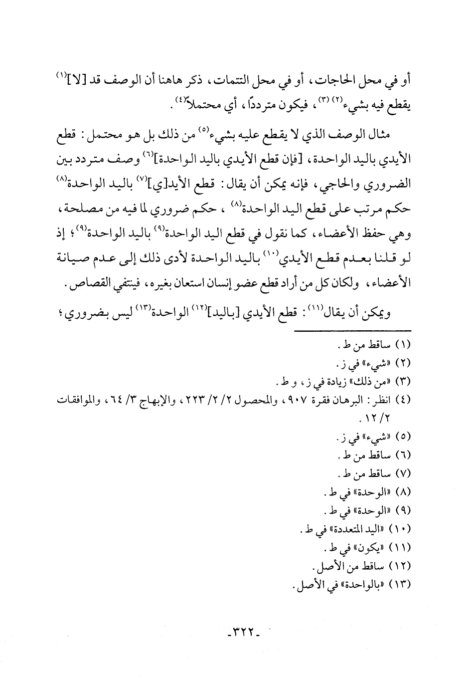 مثال الوصف الذي لا يقطع عليه بشيء (٥) من ذلك بل هو محتمل: قطع الأيدي باليد الواحدة، [فإن قطع الأيدي باليد الواحدة] (٦) وصف متردد بين الضروري والحاجي، فإنه يمكن أن يقال: قطع الأيد [ي] (٧) باليد الواحدة (٨) حكم مرتب على قطع اليد الواحدة (٨)، حكم ضروري لما فيه من مصلحة، وهي حفظ الأعضاء، كما نقول في قطع اليد الواحدة (٩) باليد الواحدة (٩)؛ إذ لو قلنا بعدم قطع الأيدي (١٠) باليد الواحدة لأدى ذلك إلى عدم صيانة الأعضاء، ولكان كل من أراد قطع عضو إنسان استعان بغيره، فينتفي القصاص.