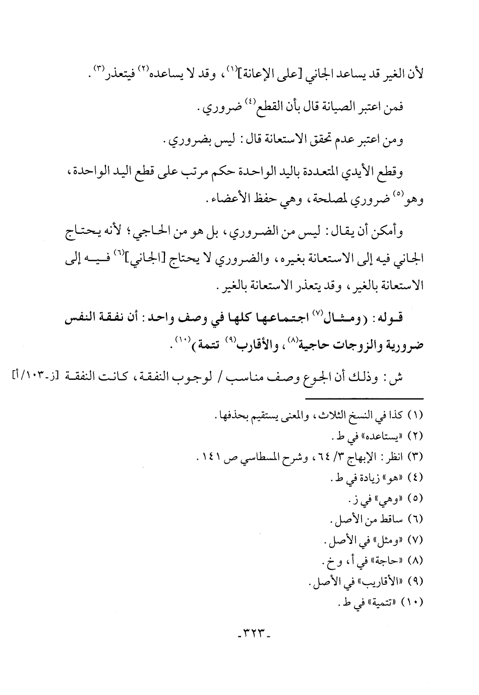 قوله: (ومثال (٧) اجتماعها كلها في وصف واحد: أن نفقة النفس ضرورية والزوجات حاجية (٨)، والأقارب (٩) تتمة) (١٠).