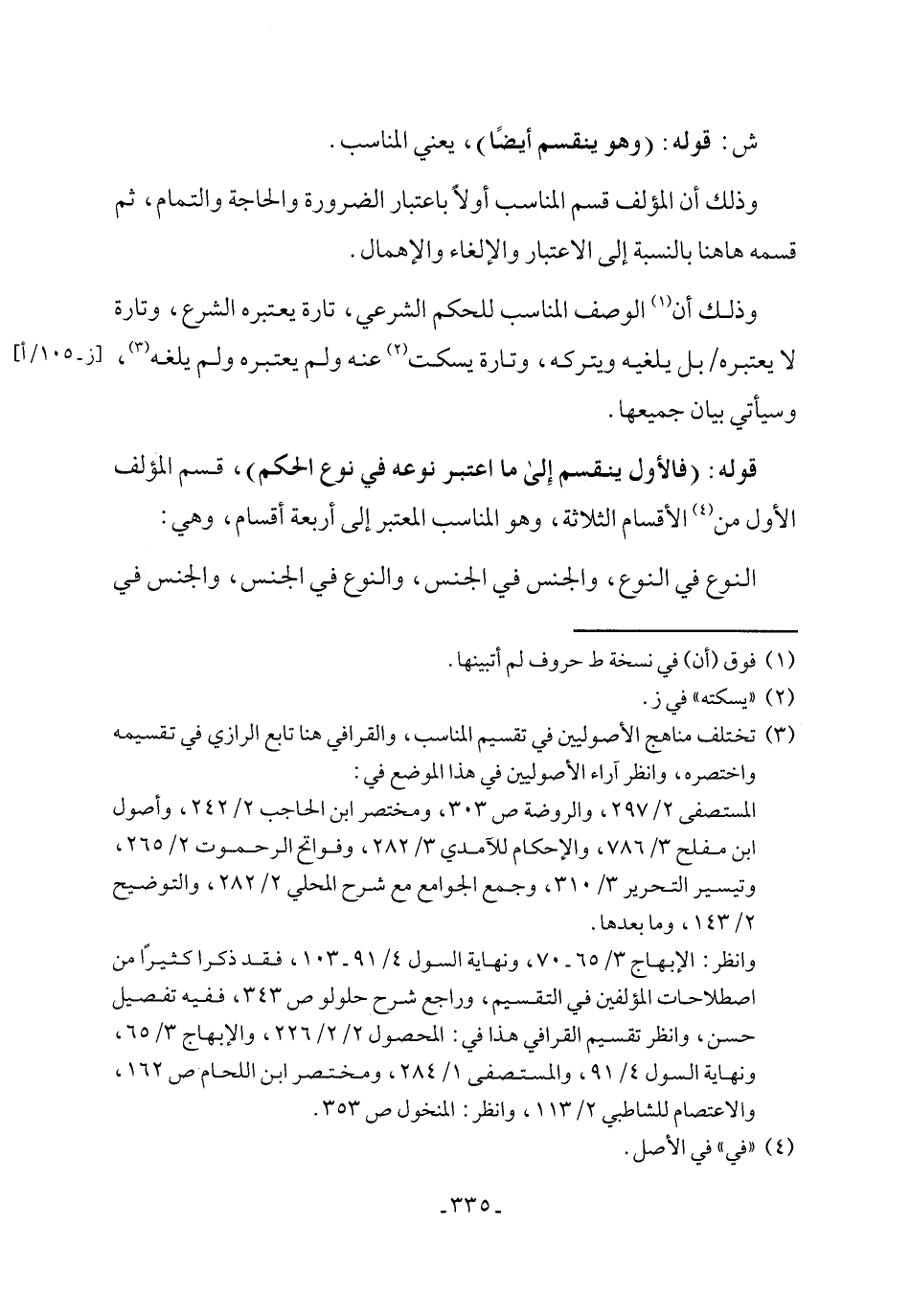 (٣) تختلف مناهج الأصوليين في تقسيم المناسب، والقرافي هنا تابع الرازي في تقسيمه واختصره، وانظر آراء الأصوليين في هذا الموضع في: