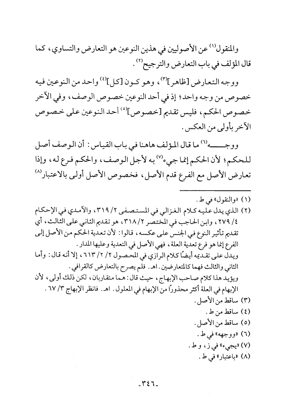 ووجه (٦) ما قال المؤلف ها هنا في باب القياس: أن الوصف أصل للحكم؛ لأن الحكم إنما جيء (٧) به لأجل الوصف، والحكم فرع له، وإذا تعارض الأصل مع الفرع قدم الأصل، فخصوص الأصل أولى بالاعتبار (٨)