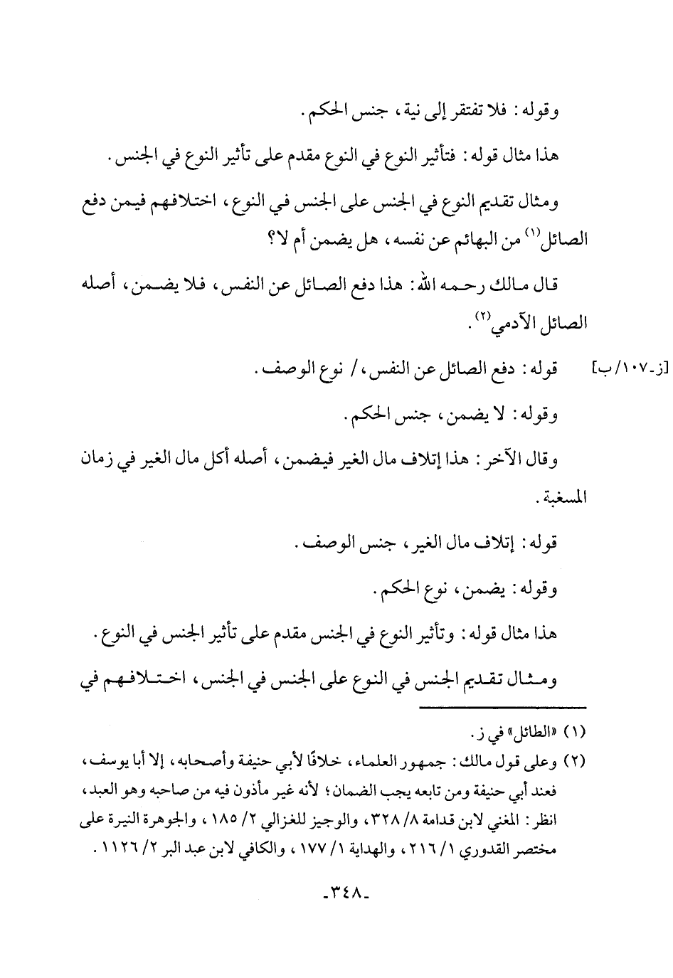 ومثال تقديم النوع في الجنس على الجنس في النوع، اختلافهم فيمن دفع الصائل (١) من البهائم عن نفسه، هل يضمن أم لا؟