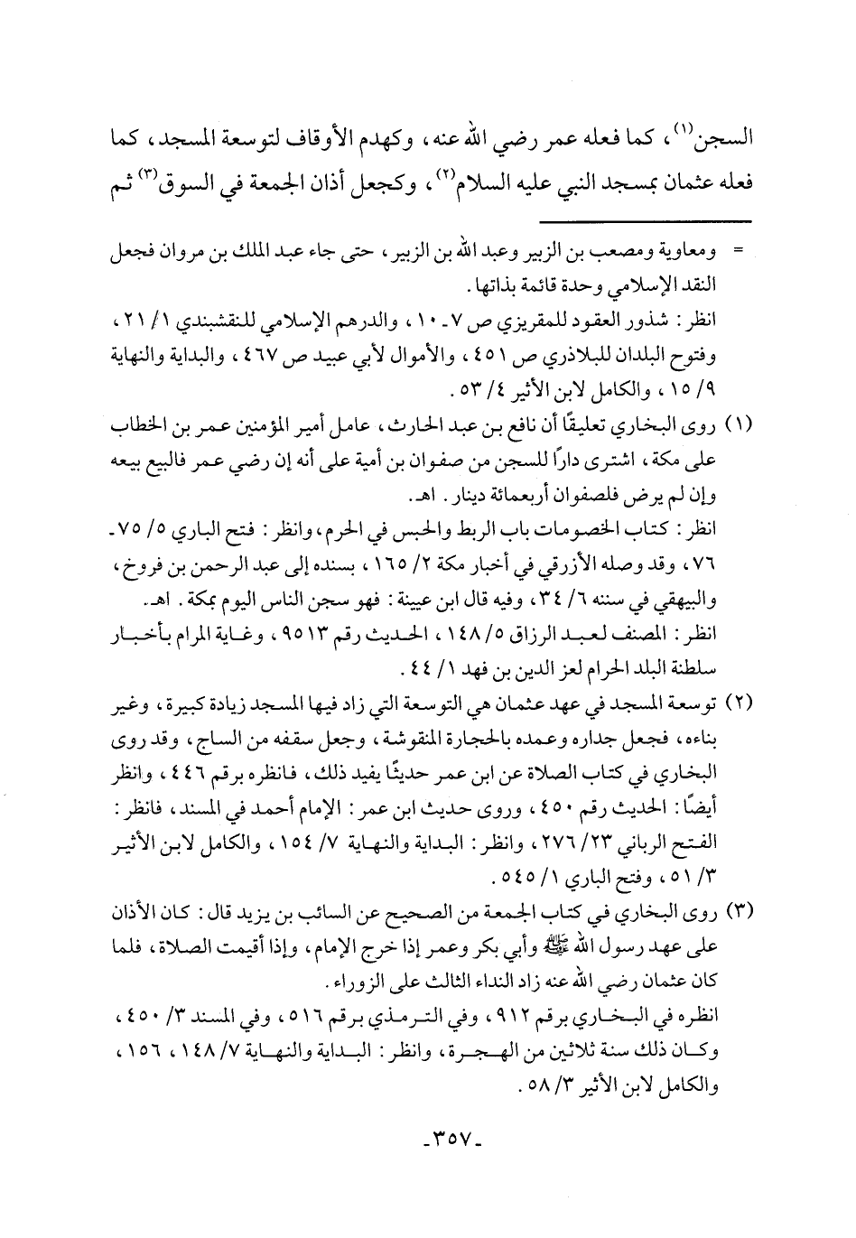 (٢) توسعة المسجد في عهد عثمان هي التوسعة التي زاد فيها المسجد زيادة كبيرة، وغير بناءه، فجعل جداره وعمده بالحجارة المنقوشة، وجعل سقفه من الساج، وقد روى البخاري في كتاب الصلاة عن ابن عمر حديثًا يفيد ذلك، فانظره برقم ٤٤٦، وانظر أيضًا: الحديث رقم ٤٥٠، وروى حديث ابن عمر: الإمام أحمد في المسند، فانظر: الفتح الرباني ٢٣/ ٢٧٦، وانظر: البداية والنهاية ٧/ ١٥٤، والكامل لابن الأثير ٣/ ٥١، وفتح الباري ١/ ٥٤٥.