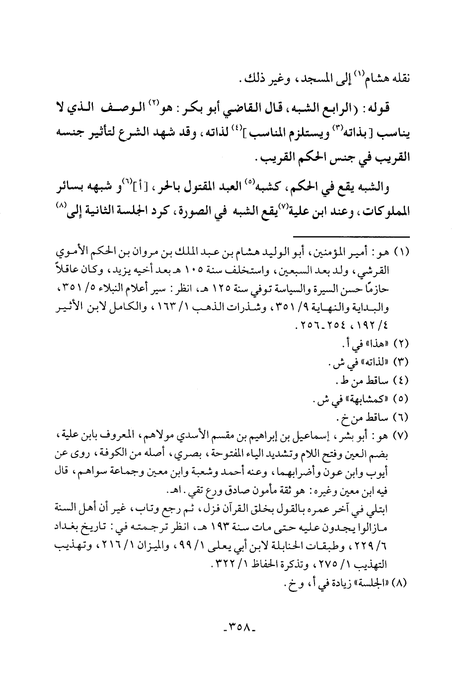 والشبه يقع في الحكم، كشبه (٥) العبد المقتول بالحر، [أ] (٦) وشبهه بسائر المملوكات، وعند ابن علية (٧) يقع الشبه في الصورة، كرد الجلسة الثانية إِلى (٨)