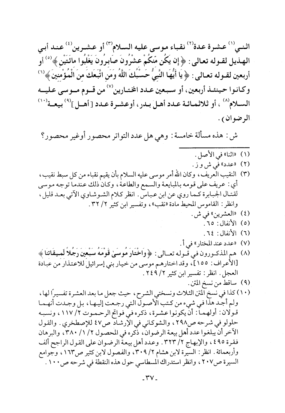 (١٠) كذا في نسخ المتن الثلاث ونسختي الشرح، حيث جعل ما بعد العشرة تفسيرًا لها، ولم أجد هذا في شيء من كتب الأصول التي رجعت إليها، بل وجدت أنهما قولان: أولهما: أن يكونوا عشرة، ذكره في فواتح الرحموت ٢/ ١١٧، ونسبه حلولو في شرحه ص ٢٩٨، والشوكاني في الإرشاد ص ٤٧ للإصطخري. والقول الآخر أن يبلغوا عدد أهل بيعة الرضوان، ذكره في المحصول ٢/ ١/ ٣٨٠، والبرهان فقرة ٤٩٥، والإبهاج ٢/ ٣٢٣. وعدد أهل بيعة الرضوان على القول الراجح ألف وأربعمائة. انظر: السيرة لابن هشام ٢/ ٣٠٩، والفصول لابن كثير ص ١٦٣، وجوامع السيرة ص ٢٠٧، وانظر استدراك المسطاسي حول هذه النقطة في شرحه ص ١٠٠.