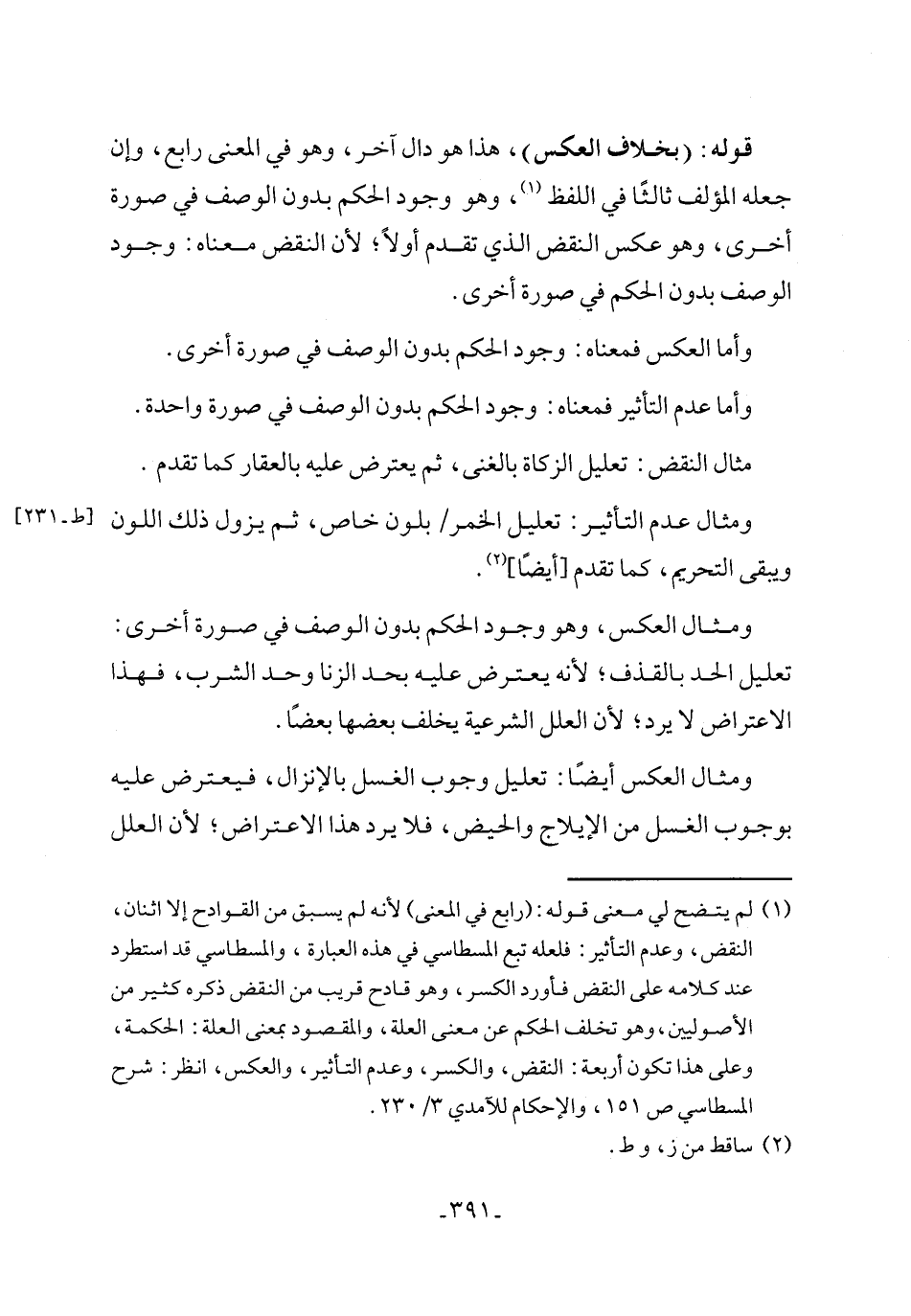 (١) لم يتضح لي معنى قوله: (رابع في المعنى) لأنه لم يسبق من القوادح إلا اثنان، النقض، وعدم التأثير: فلعله تبع المسطاسي في هذه العبارة، والمسطاسي قد استطرد عند كلامه على النقض فأورد الكسر، وهو قادح قريب من النقض ذكره كثير من الأصوليين، وهو تخلف الحكم عن معنى العلة، والمقصود بمعنى العلة: الحكمة، وعلى هذا تكون أربعة: النقض، والكسر، وعدم التأثير، والعكس، انظر: شرح المسطاسي ص ١٥١، والإحكام للآمدي ٣/ ٢٣٠.