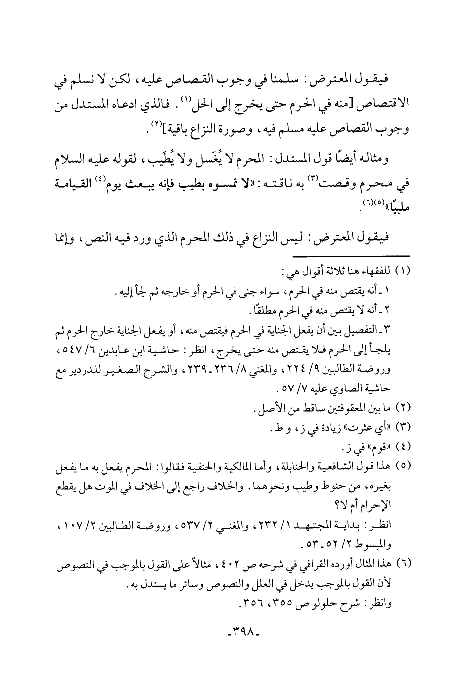 فيقول المعترض: سلمنا في وجوب القصاص عليه، لكن لا نسلم في الاقتصاص [منه في الحرم حتى يخرج إلى الحل (١). فالذي ادعاه المستدل من وجوب القصاص عليه مسلم فيه، وصورة النزاع باقية] (٢).