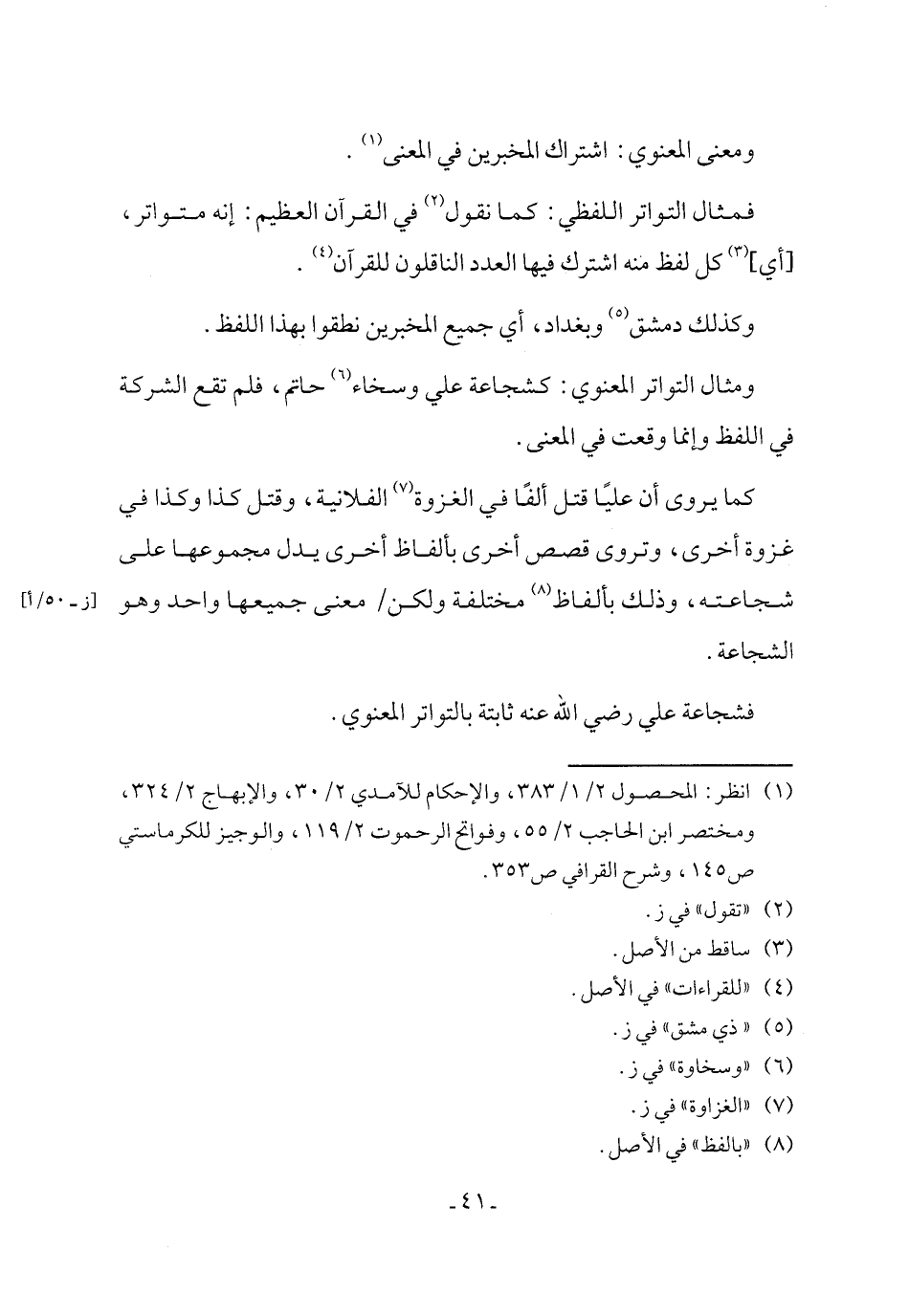 ومثال التواتر المعنوي: كشجاعة علي وسخاء (٦) حاتم، فلم تقع الشركة في اللفظ وإنما وقعت في المعنى.