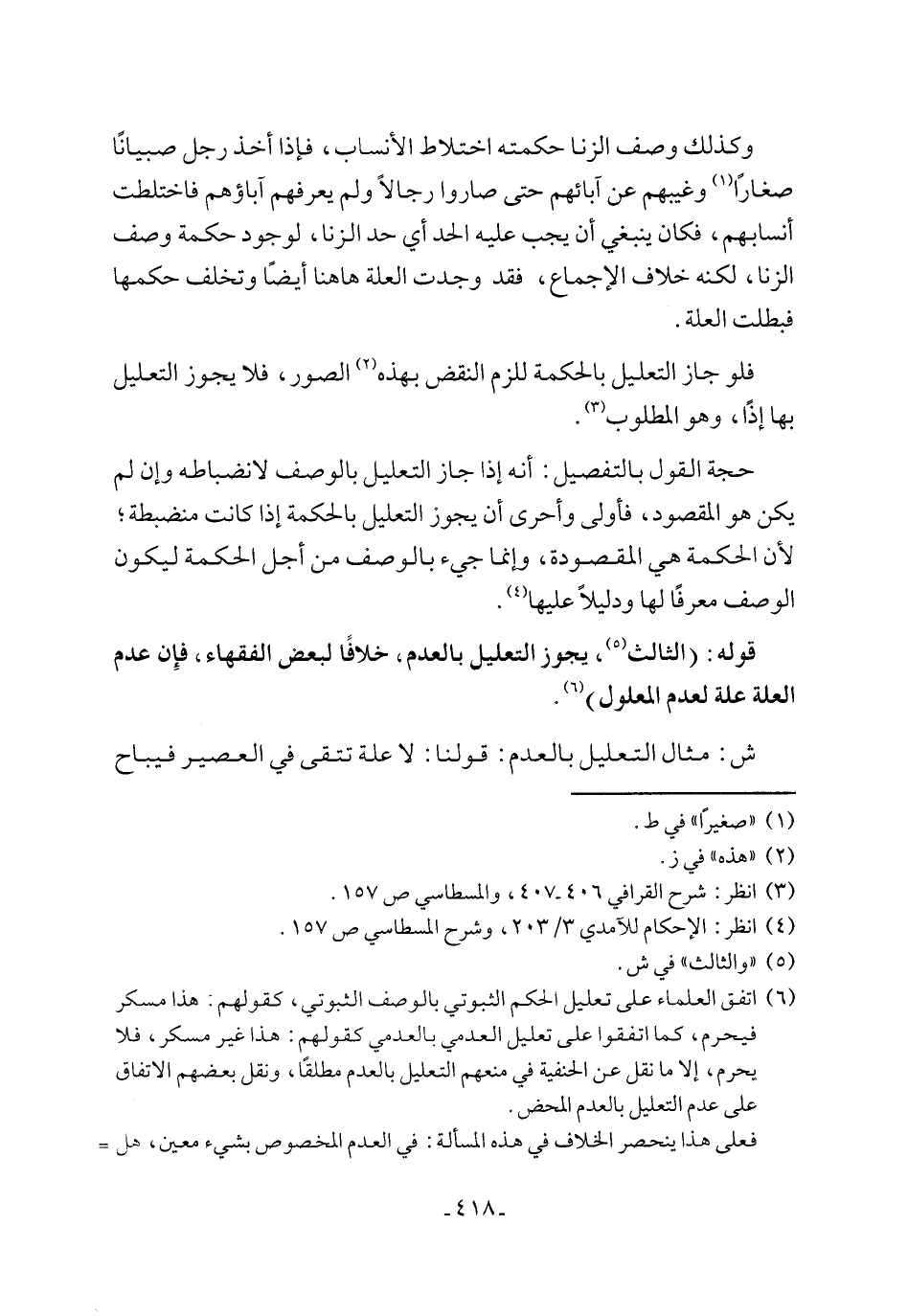 (٦) اتفق العلماء على تعليل الحكم الثبوتي بالوصف الثبوتي، كقولهم: هذا مسكر فيحرم، كما اتفقوا على تعليل العدمي بالعدمي كقولهم: هذا غير مسكر، فلا يحرم، إلا ما نقل عن الحنفية في منعهم التعليل بالعدم مطلقًا، ونقل بعضهم الاتفاق على عدم التعليل بالعدم المحض.