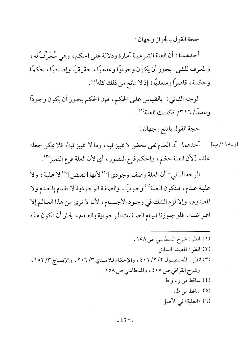الوجه الثاني: بالقياس على الحكم، فإن الحكم يجوز أن يكون وجودًا وعدمًا/ ٣١٦/ فكذلك العلة (٢).