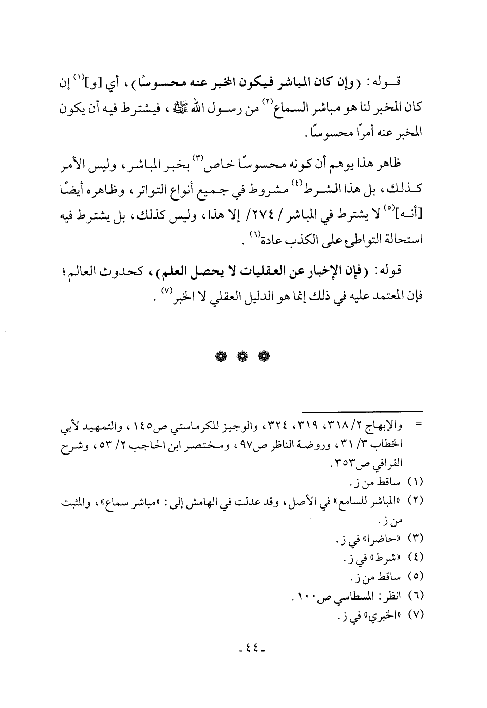 ظاهر هذا يوهم أن كونه محسوسًا خاص (٣) بخبر المباشر، وليس الأمر كذلك، بل هذا الشرط (٤) مشروط في جميع أنواع التواتر، وظاهره أيضًا [أنه] (٥) لا يشترط في المباشر/ ٢٧٤/ إلا هذا، وليس كذلك، بل يشترط فيه استحالة التواطئ على الكذب عادة (٦).
