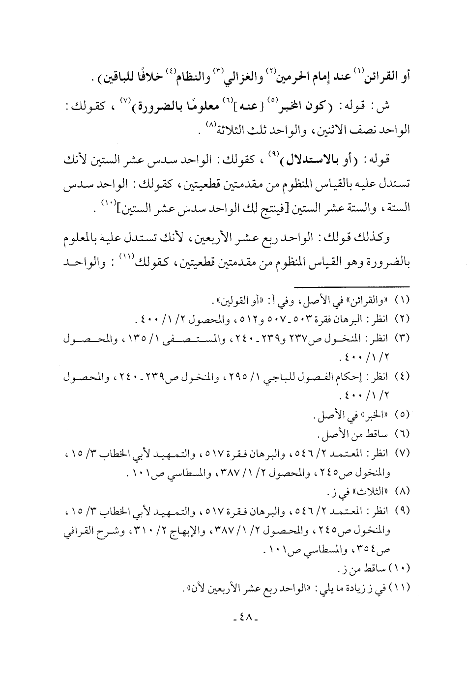 وكذلك قولك: الواحد ربع عشر الأربعين، لأنك تستدل عليه بالمعلوم بالضرورة وهو القياس المنظوم من مقدمتين قطعيتين، كقولك (١١): والواحد