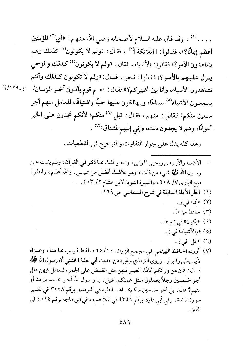 (١)، وقد قال عليه السلام لأصحابه رضي الله عنهم: "أي (٢) المؤمنين أعظم إيمانًا؟ "، فقالوا: [الملائكة] (٣)، فقال: "ولم لا يكونون (٤) كذلك وهم يشاهدون الأمر؟ " فقالوا: الأنبياء، فقال: "ولم لا يكونون (٤) كذلك والوحي ينزل عليهم بالأمر؟ " فقالوا: نحن، فقال: "ولم لا تكونون كذلك وأنتم تشاهدون الأشياء، وأنا بين أظهركم؟ " فقال: "هم قوم يأتون آخر الزمان يسمعون الأشياء (٥) سماعًا، ويتهالكون عليها حبًا واشتياقًا، للعامل منهم أجر سبعين منكم" فقالوا: منهم، فقال: "بل (٦) منكم؛ لأنكم تجدون على الخير أعوانًا، وهم لا يجدون ذلك، وإني إليهم لمشتاق" (٧).
