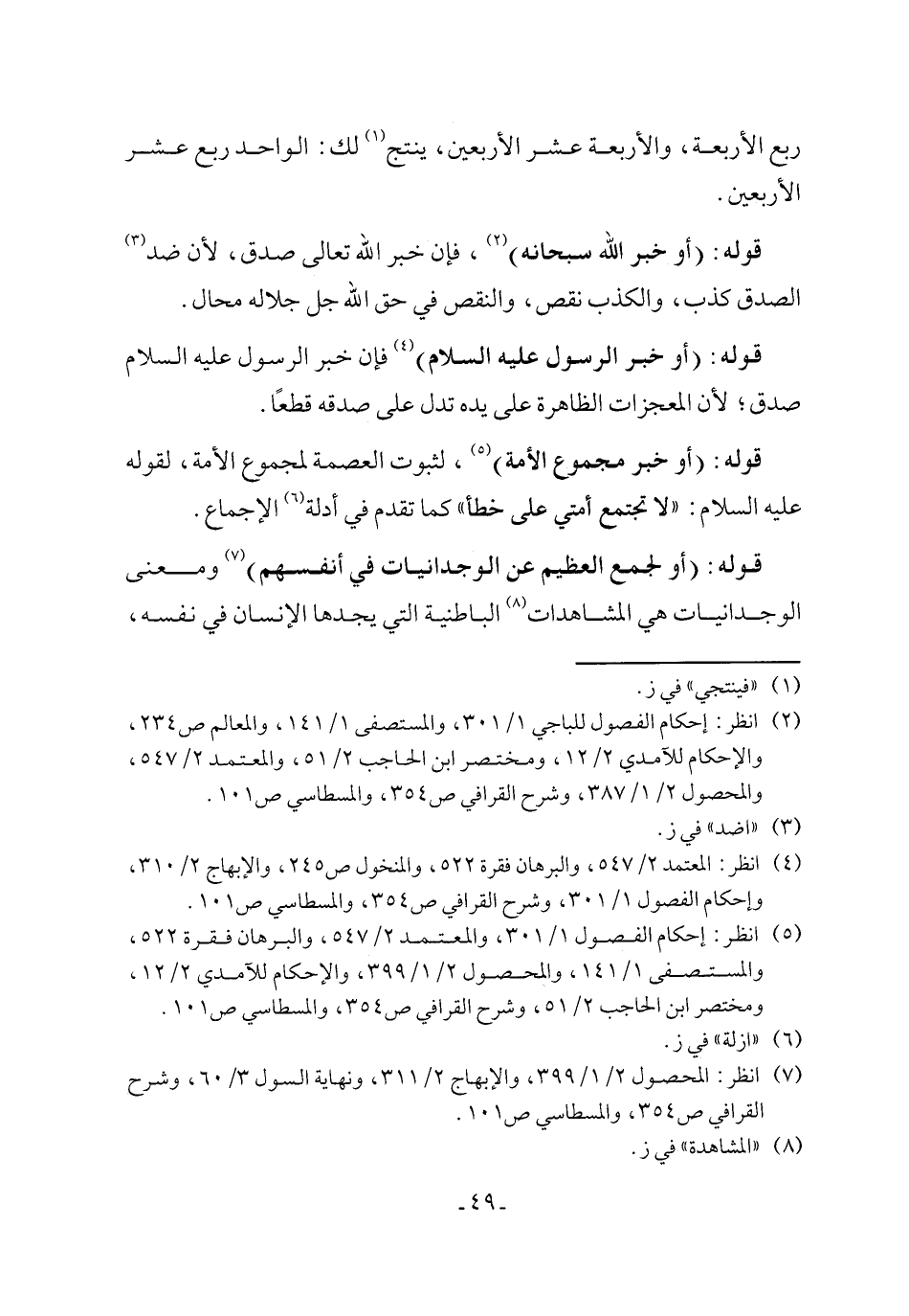 قوله: (أو لجمع العظيم عن الوجدانيات في أنفسهم) (٧) ومعنى الوجدانيات هي المشاهدات (٨) الباطنية التي يجدها الإنسان في نفسه،