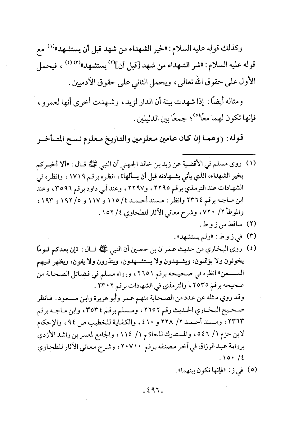 (١) روى مسلم في الأقضية عن زيد بن خالد الجهني أن النبي - صلى الله عليه وسلم - قال: "ألا أخبركم بخير الشهداء، الذي يأتي بشهادته قبل أن يسألها"، انظره برقم ١٧١٩، وانظره في الشهادات عند الترمذي برقم ٢٢٩٥، و٢٢٩٧، وعند أبي داود برقم ٣٥٩٦، وعند ابن ماجه برقم ٢٣٦٤ وانظر: مسند أحمد ٤/ ١١٥ و١١٧ و٥/ ١٩٢ و١٩٣، والموطأ ٢/ ٧٢٠، وشرح معاني الآثار للطحاوي ٤/ ١٥٢.