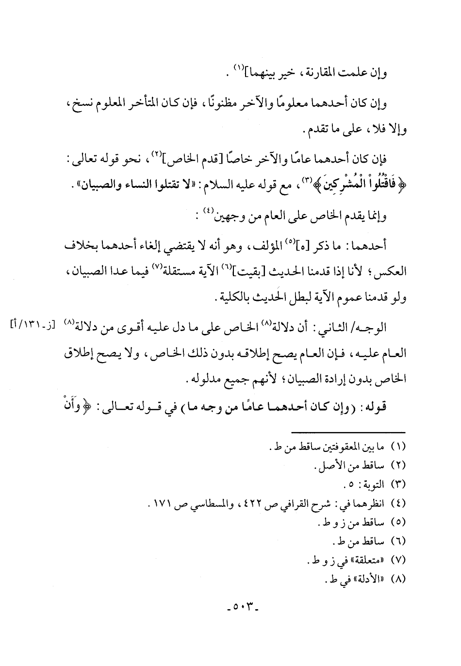 فإن كان أحدهما عامًا والآخر خاصًا [قدم الخاص] (٢)، نحو قوله تعالى: {فَاقْتُلُواْ الْمُشْرِكِينَ} (٣)، مع قوله عليه السلام: "لا تقتلوا النساء والصبيان".