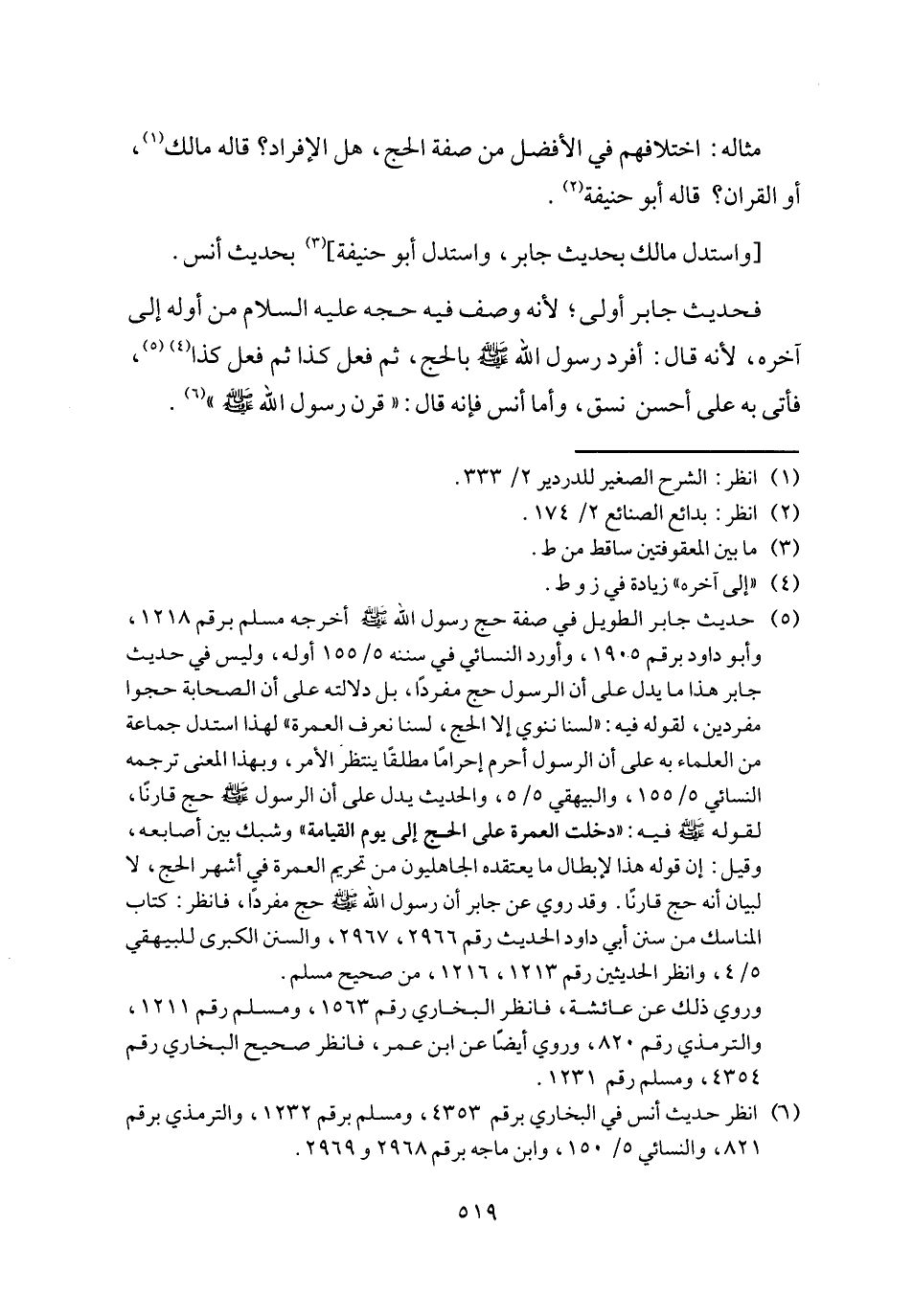 (٥) حديث جابر الطويل في صفة حج رسول الله - صلى الله عليه وسلم - أخرجه مسلم برقم ١٢١٨، وأبو داود برقم ١٩٠٥، وأورد النسائي في سننه ٥/ ١٥٥ أوله، وليس في حديث جابر هذا ما يدل على أن الرسول حج مفردًا، بل دلالته على أن الصحابة حجوا مفردين، لقوله فيه: "لسنا ننوي إلا الحج، لسنا نعرف العمرة" لهذا استدل جماعة من العلماء به على أن الرسول أحرم إحرامًا مطلقًا ينتظر الأمر، وبهذا المعنى ترجمه النسائي ٥/ ١٥٥، والبيهقي ٥/ ٥، والحديث يدل على أن الرسول - صلى الله عليه وسلم - حج قارنًا، لقوله - صلى الله عليه وسلم - فيه: "دخلت العمرة على الحج إلى يوم القيامة" وشبك بين أصابعه، وقيل: إن قوله هذا لإبطال ما يعتقده الجاهليون من تحريم العمرة في أشهر الحج، لا لبيان أنه حج قارنًا. وقد روي عن جابر أن رسول الله - صلى الله عليه وسلم - حج مفردًا، فانظر: كتاب المناسك من سنن أبي داود الحديث رقم ٢٩٦٦، ٢٩٦٧، والسنن الكبرى للبيهقي ٥/ ٤، وانظر الحديثين رقم ١٢١٣، ١٢١٦، من صحيح مسلم.