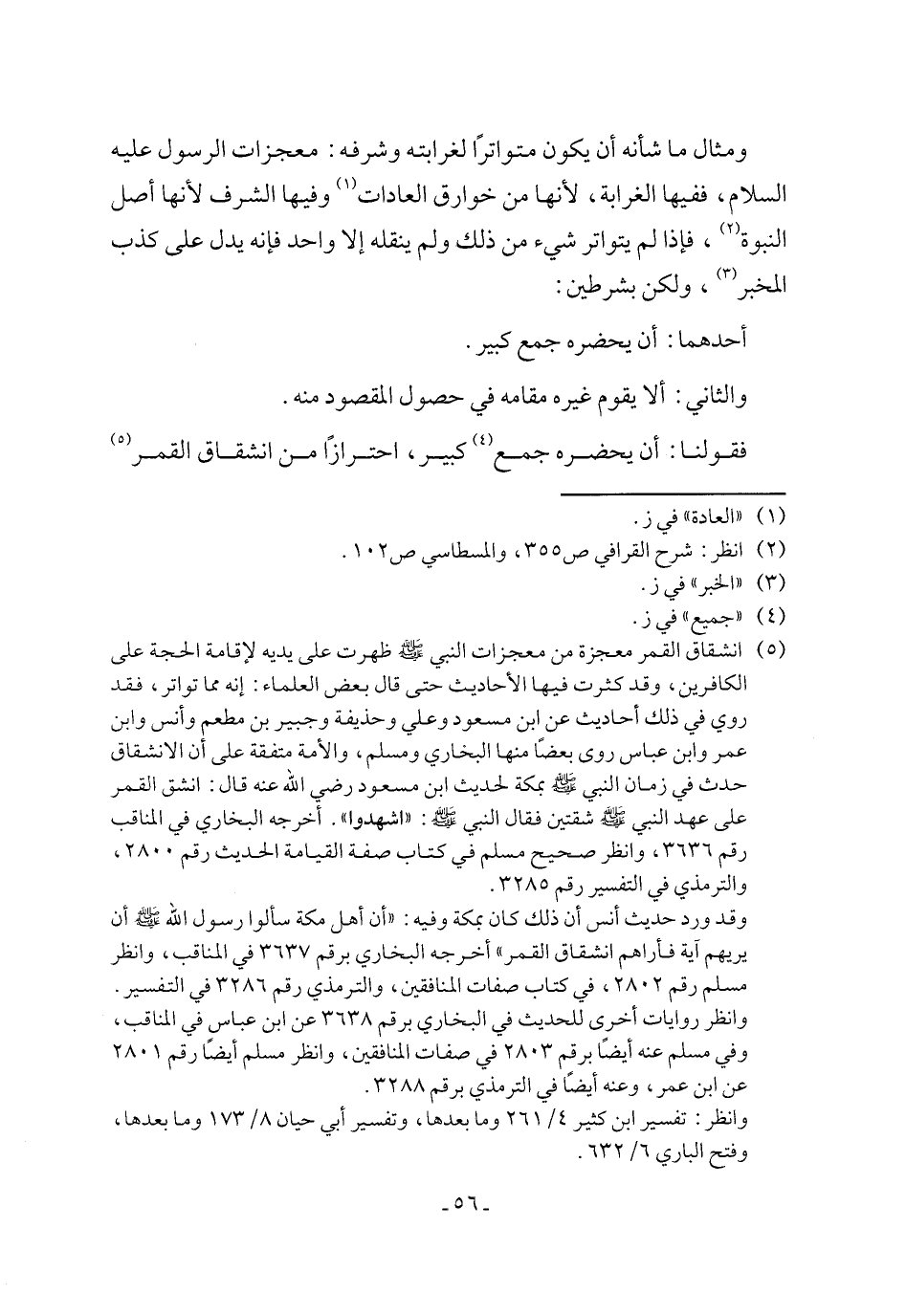 (٥) انشقاق القمر معجزة من معجزات النبي - صلى الله عليه وسلم - ظهرت على يديه لإقامة الحجة على الكافرين، وقد كثرت فيها الأحاديث حتى قال بعض العلماء: إنه مما تواتر، فقد روي في ذلك أحاديث عن ابن مسعود وعلي وحذيفة وجبير بن مطعم وأنس وابن عمر وابن عباس روى بعضًا منها البخاري ومسلم، والأمة متفقة على أن الانشقاف حدث في زمان النبي - صلى الله عليه وسلم - بمكة لحديث ابن مسعود رضي الله عنه قال: انشق القمر على عهد النبي - صلى الله عليه وسلم - شقتين فقال النبي - صلى الله عليه وسلم -: "اشهدوا". أخرجه البخاري في المناقب رقم ٣٦٣٦، وانظر صحيح مسلم في كتاب صفة القيامة الحديث رقم ٢٨٠٠، والترمذي في التفسير رقم ٣٢٨٥.