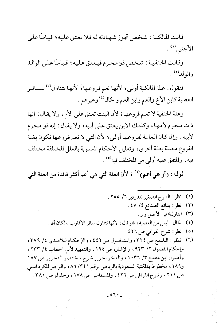 وعلة الحنفية لا تعم فروعها؛ لأن البنت تعتق على الأم، ولا يقال: إنها ذات محرم لأمها، وكذلك الابن يعتق على أبيه، ولا يقال: إنه ذو محرم لأبيه. وإنما كان العامة لفروعها أولى؛ لأن التي لا تعم فروعها تكون بقية الفروع معللة بعلة أخرى، وتعليل الأحكام المستوية بالعلل المختلفة مختلف فيه، والمتفق عليه أولى من المختلف فيه (٥).