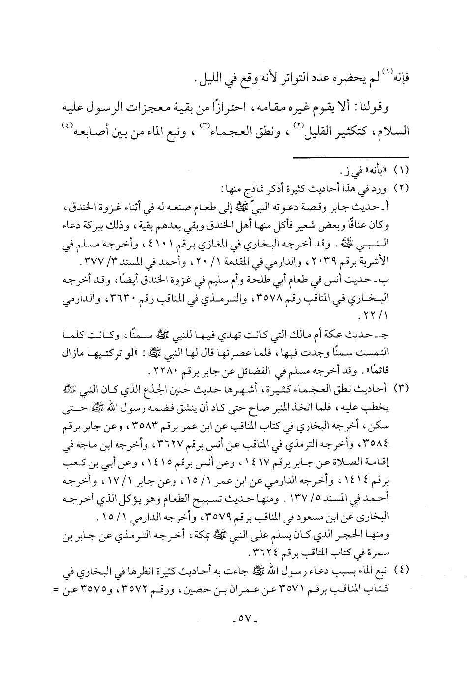 (٣) أحاديث نطق العجماء كثيرة، أشهرها حديث حنين الجذع الذي كان النبي - صلى الله عليه وسلم - يخطب عليه، فلما اتخذ المنبر صاح حتى كاد أن ينشق فضمه رسول الله - صلى الله عليه وسلم - حتى سكن، أخرجه البخاري في كتاب المناقب عن ابن عمر برقم ٣٥٨٣، وعن جابر برقم ٣٥٨٤، وأخرجه الترمذي في المناقب عن أنس برقم ٣٦٢٧، وأخرجه ابن ماجه في إقامة الصلاة عن جابر برقم ١٤١٧، وعن أنس برقم ١٤١٥، وعن أبي بن كعب برقم ١٤١٤، وأخرجه الدارمي عن ابن عمر ١/ ١٥، وعن جابر ١/ ١٧، وأخرجه أحمد في المسند ٥/ ١٣٧. ومنها حديث تسبيح الطعام وهو يؤكل الذي أخرجه البخاري عن ابن مسعود في المناقب برقم ٣٥٧٩، وأخرجه الدارمي ١/ ١٥.