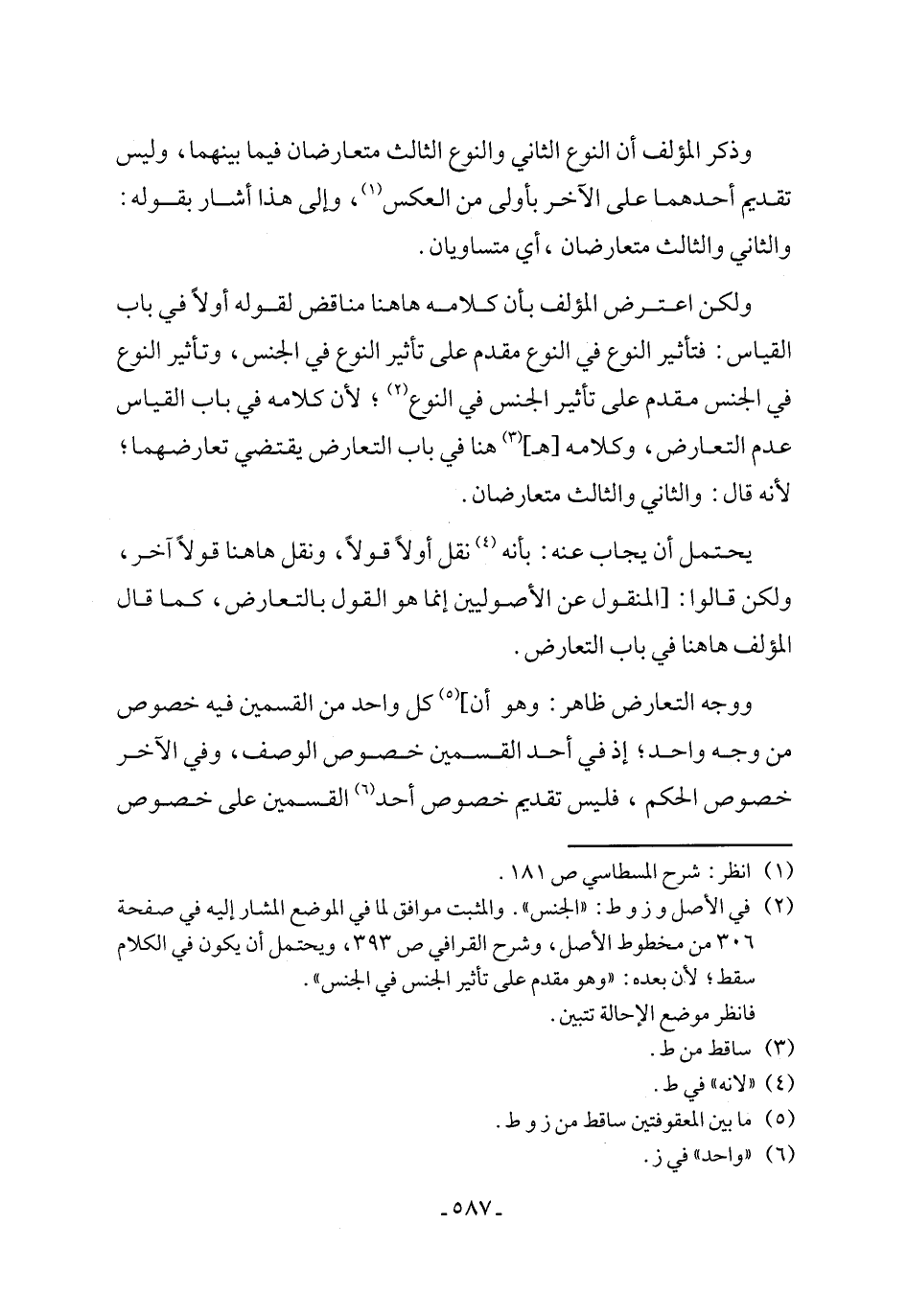 ولكن اعترض المؤلف بأن كلامه ها هنا مناقض لقوله أولاً في باب القياس: فتأثير النوع في النوع مقدم على تأثير النوع في الجنس، وتأثير النوع في الجنس مقدم على تأثير الجنس في النوع (٢)؛ لأن كلامه في باب القياس عدم التعارض، وكلامه [هـ] (٣) هنا في باب التعارض يقتضي تعارضهما؛ لأنه قال: والثاني والثالث متعارضان.