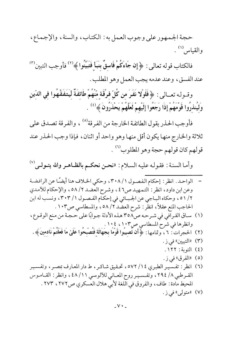 وقوله تعالى: {فَلَوْلَا نَفَرَ مِنْ كُلِّ فِرْقَةٍ مِنْهُمْ طَائِفَةٌ لِيَتَفَقَّهُوا فِي الدِّينِ وَلِيُنْذِرُوا قَوْمَهُمْ إِذَا رَجَعُوا إِلَيْهِمْ لَعَلَّهُمْ يَحْذَرُونَ} (٤).
