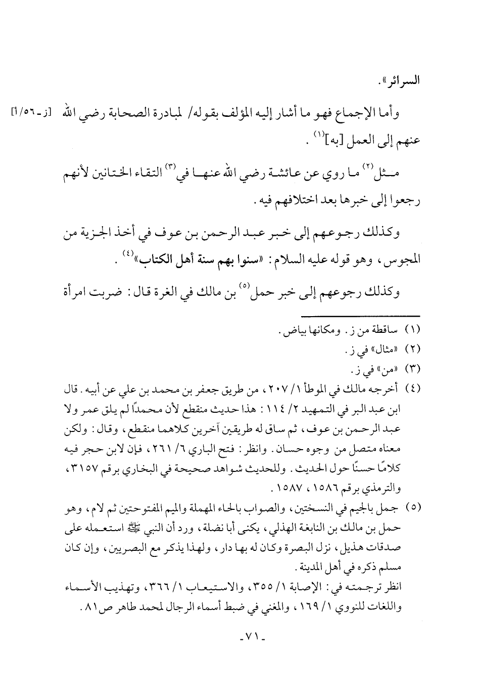 وكذلك رجوعهم إلى خبر عبد الرحمن بن عوف في أخذ الجزية من المجوس، وهو قوله عليه السلام: "سنوا بهم سنة أهل الكتاب" (٤).