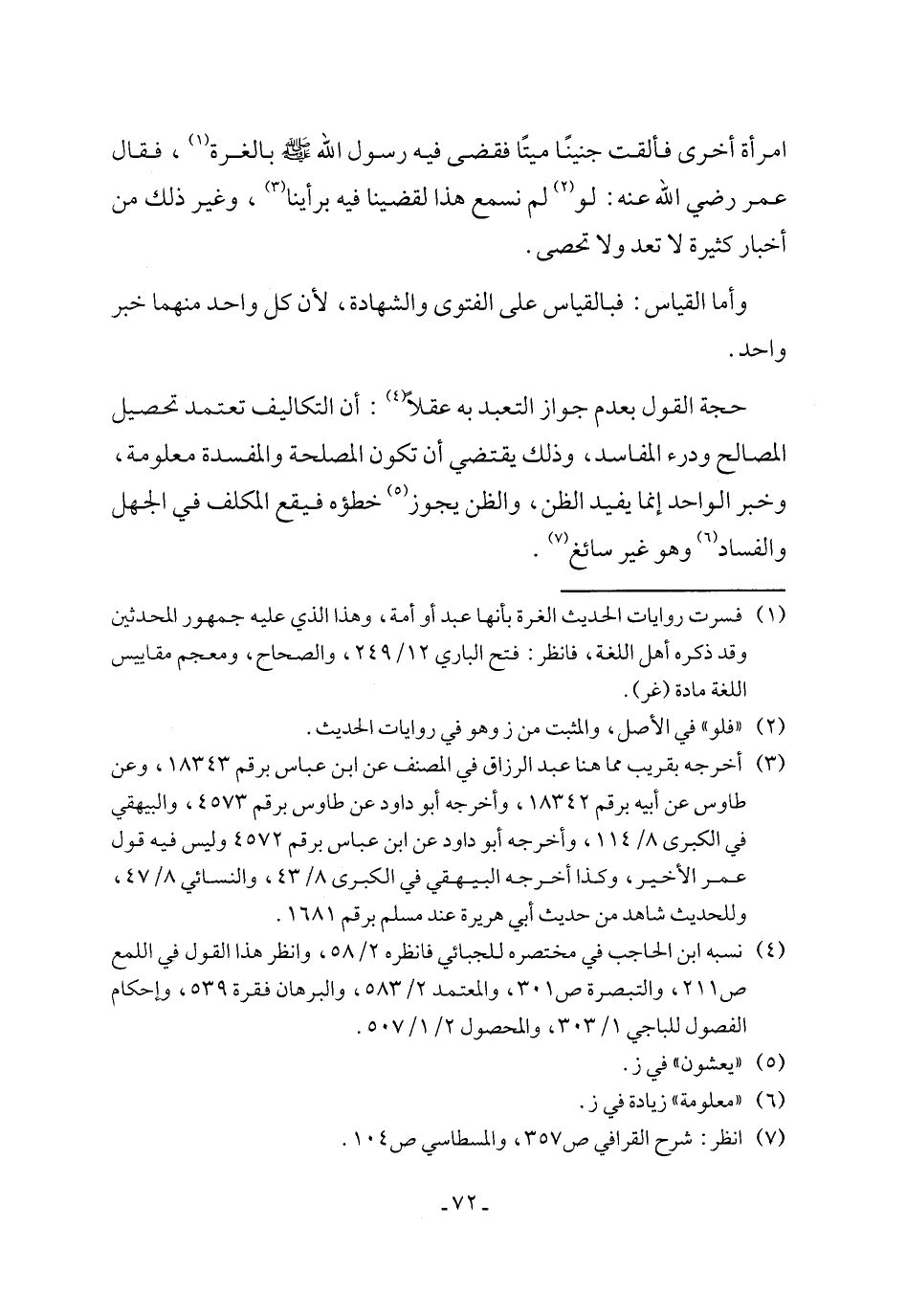 امرأة أخرى فألقت جنينًا ميتًا فقضى فيه رسول الله - صلى الله عليه وسلم - بالغرة (١)، فقال عمر رضي الله عنه: لو (٢) لم نسمع هذا لقضينا فيه برأينا (٣)، وغير ذلك من أخبار كثيرة لا تعد ولا تحصى.