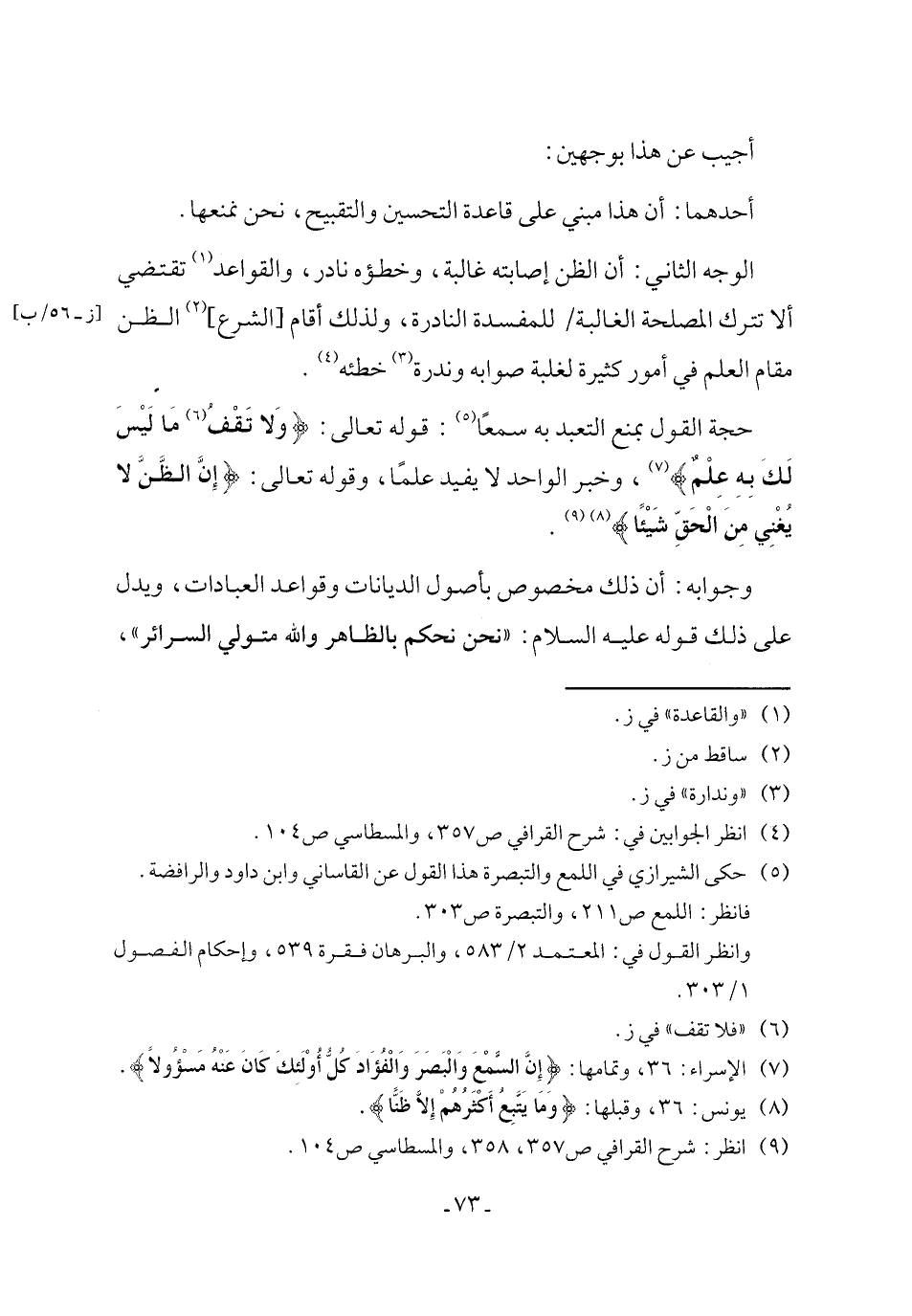 (٤) انظر الجوابين في: شرح القرافي ص ٣٥٧، والمسطاسي ص ١٠٤.