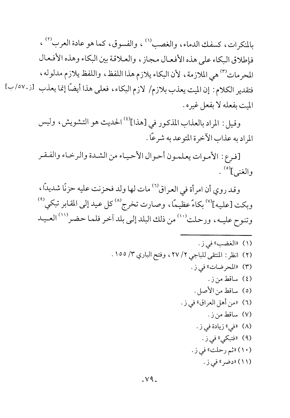 بالمنكرات، كسفك الدماء، والغصب (١)، والفسوق، كما هو عادة العرب (٢)، فإطلاق البكاء على هذه الأفعال مجاز، والعلاقة بين البكاء وهذه الأفعال المحرمات (٣) هي الملازمة، لأن البكاء يلازم هذا اللفظ، واللفظ يلازم مدلوله، فتقدير الكلام: إن الميت يعذب بلازم لازم البكاء، فعلى هذا أيضًا إنما يعذب الميت بفعله لا بفعل غيره.