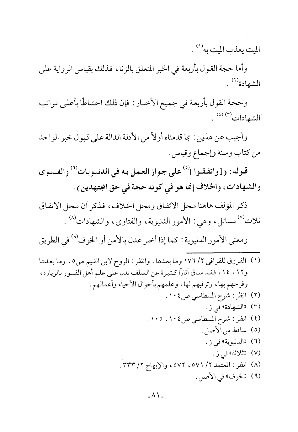 قوله: ([واتفقوا] (٥) على جواز العمل به في الدنيويات (٦) والفتوى والشهادات، والخلاف إِنما هو في كونه حجة في حق المجتهدين).