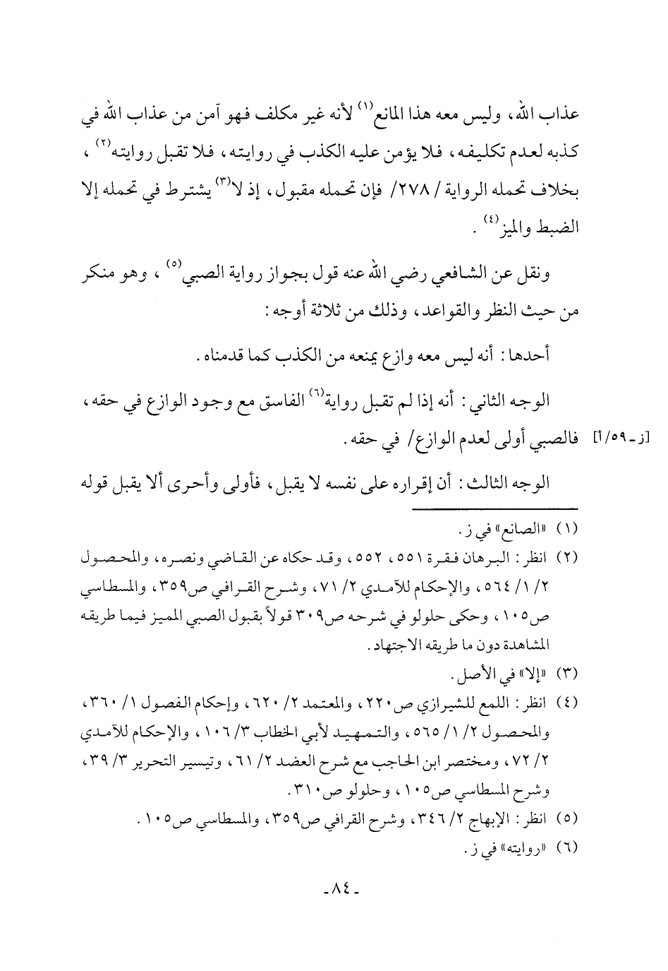 ونقل عن الشافعي رضي الله عنه قول بجواز رواية الصبي (٥)، وهو منكر من حيث النظر والقواعد، وذلك من ثلاثة أوجه: