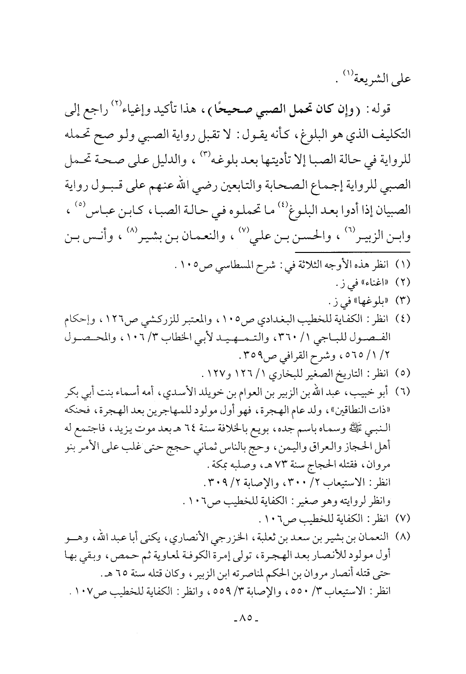 قوله: (وإِن كان تحمل الصبي صحيحًا)، هذا تأكيد وإغياء (٢) راجع إلى التكليف الذي هو البلوغ، كأنه يقول: لا تقبل رواية الصبي ولو صح تحمله للرواية في حالة الصبا إلا تأديتها بعد بلوغه (٣)، والدليل على صحة تحمل الصبي للرواية إجماع الصحابة والتابعين رضي الله عنهم على قبول رواية الصبيان إذا أدوا بعد البلوغ (٤) ما تحملوه في حالة الصبا، كابن عباس (٥)، وابن الزبير (٦)، والحسن بن علي (٧)، والنعمان بن بشير (٨)، وأنس بن