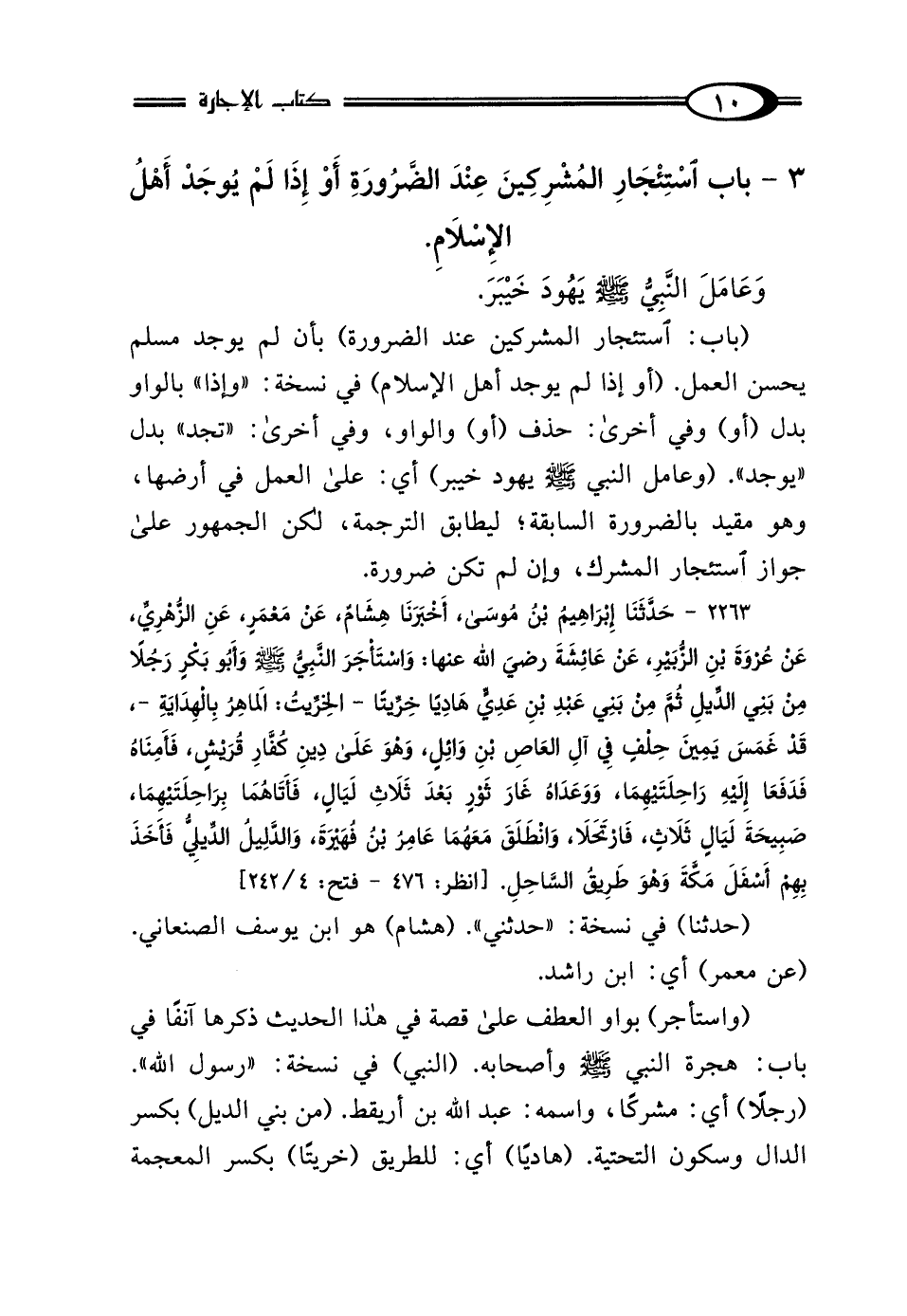 3 - بَابُ اسْتِئْجَارِ المُشْرِكِينَ عِنْدَ الضَّرُورَةِ، أَوْ: إِذَا لَمْ يُوجَدْ أَهْلُ الإِسْلامِ