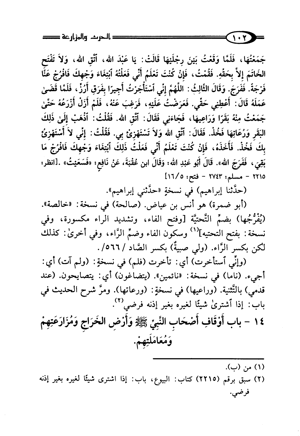 14 - بَابُ أَوْقَافِ أَصْحَابِ النَّبِيِّ صَلَّى اللهُ عَلَيْهِ وَسَلَّمَ، وَأَرْضِ الخَرَاجِ وَمُزَارَعَتِهِمْ، وَمُعَامَلَتِهِمْ