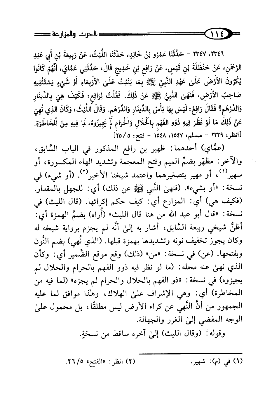 2346، 2347 - حَدَّثَنَا عَمْرُو بْنُ خَالِدٍ، حَدَّثَنَا اللَّيْثُ، عَنْ رَبِيعَةَ بْنِ أَبِي عَبْدِ الرَّحْمَنِ، عَنْ حَنْظَلَةَ بْنِ قَيْسٍ، عَنْ رَافِعِ بْنِ خَدِيجٍ، قَال: حَدَّثَنِي عَمَّايَ، أَنَّهُمْ كَانُوا يُكْرُونَ الأَرْضَ عَلَى عَهْدِ النَّبِيِّ صَلَّى اللهُ عَلَيْهِ وَسَلَّمَ بِمَا يَنْبُتُ عَلَى الأَرْبِعَاءِ أَوْ شَيْءٍ يَسْتَثْنِيهِ صَاحِبُ الأَرْضِ "فَنَهَى النَّبِيُّ صَلَّى اللهُ عَلَيْهِ وَسَلَّمَ عَنْ ذَلِكَ"، فَقُلْتُ لِرَافِعٍ: فَكَيْفَ هِيَ بِالدِّينَارِ وَالدِّرْهَمِ؟ فَقَال رَافِعٌ: "لَيْسَ بِهَا بَأْسٌ بِالدِّينَارِ وَالدِّرْهَمِ"، وَقَال اللَّيْثُ: "وَكَانَ الَّذِي نُهِيَ عَنْ ذَلِكَ مَا لَوْ نَظَرَ فِيهِ ذَوُو الفَهْمِ بِالحَلالِ وَالحَرَامِ، لَمْ يُجِيزُوهُ لِمَا فِيهِ مِنَ المُخَاطَرَةِ".
