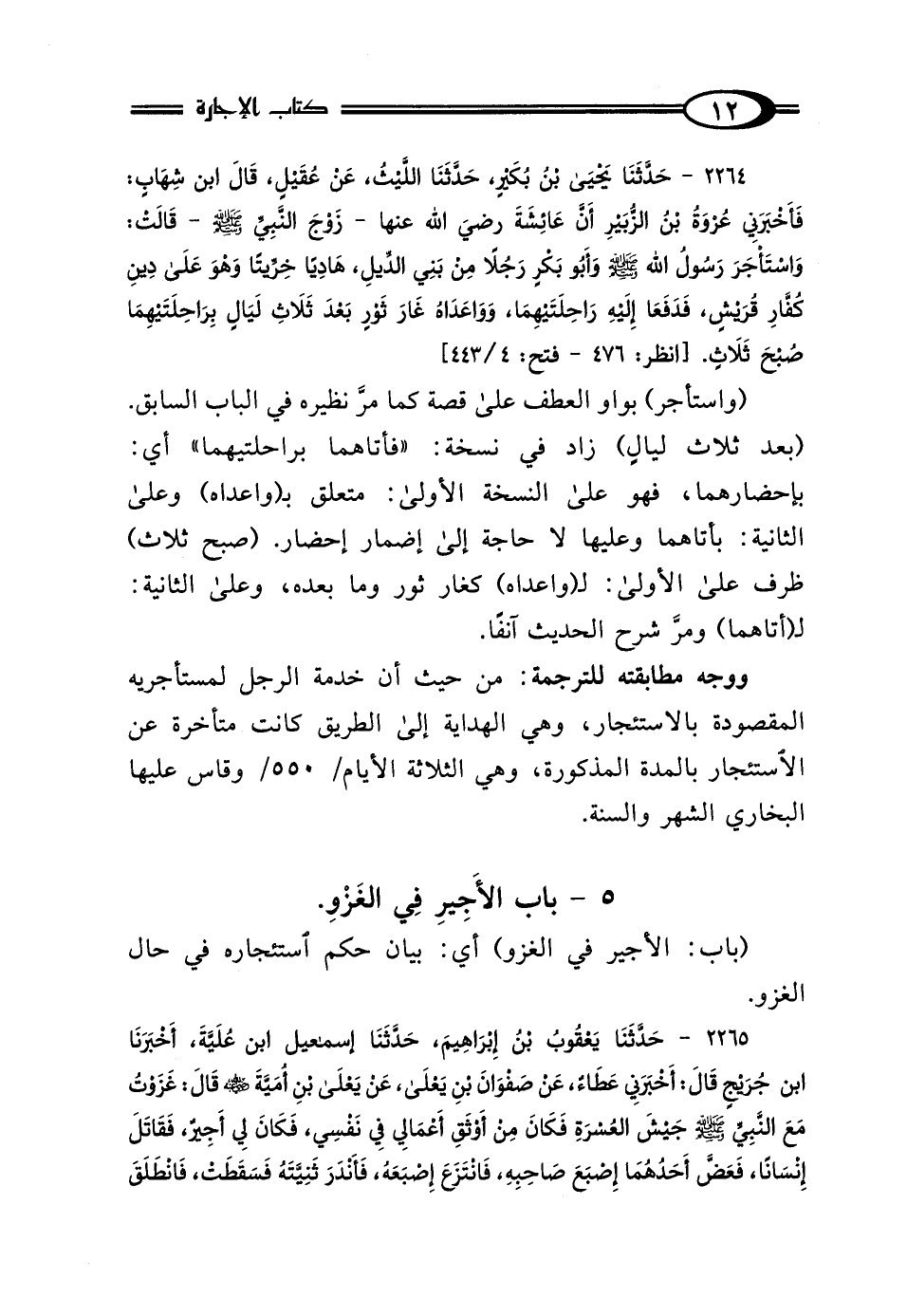 2264 - حَدَّثَنَا يَحْيَى بْنُ بُكَيْرٍ، حَدَّثَنَا اللَّيْثُ، عَنْ عُقَيْلٍ، قَال ابْنُ شِهَابٍ: فَأَخْبَرَنِي عُرْوَةُ بْنُ الزُّبَيْرِ، أَنَّ عَائِشَةَ رَضِيَ اللَّهُ عَنْهَا، زَوْجَ النَّبِيِّ صَلَّى اللهُ عَلَيْهِ وَسَلَّمَ، قَالتْ: "وَاسْتَأْجَرَ رَسُولُ اللَّهِ صَلَّى اللهُ عَلَيْهِ وَسَلَّمَ، وَأَبُو بَكْرٍ رَجُلًا مِنْ بَنِي الدِّيلِ هَادِيًا خِرِّيتًا، وَهُوَ عَلَى دِينِ كُفَّارِ قُرَيْشٍ، فَدَفَعَا إِلَيْهِ رَاحِلَتَيْهِمَا، وَوَاعَدَاهُ غَارَ ثَوْرٍ بَعْدَ ثَلاثِ لَيَالٍ بِرَاحِلَتَيْهِمَا صُبْحَ ثَلاثٍ".